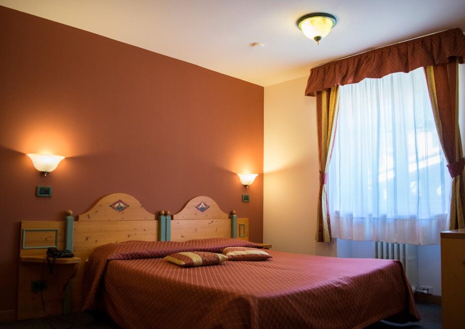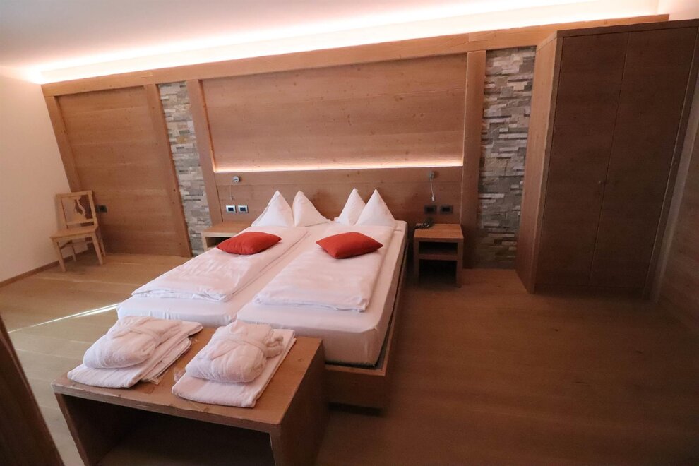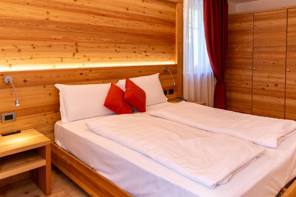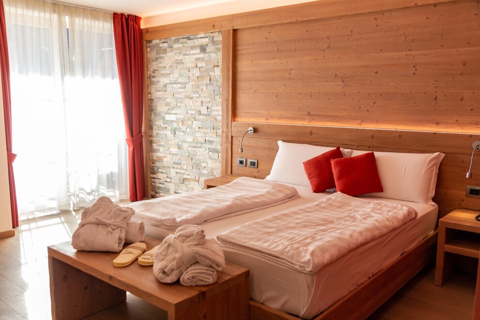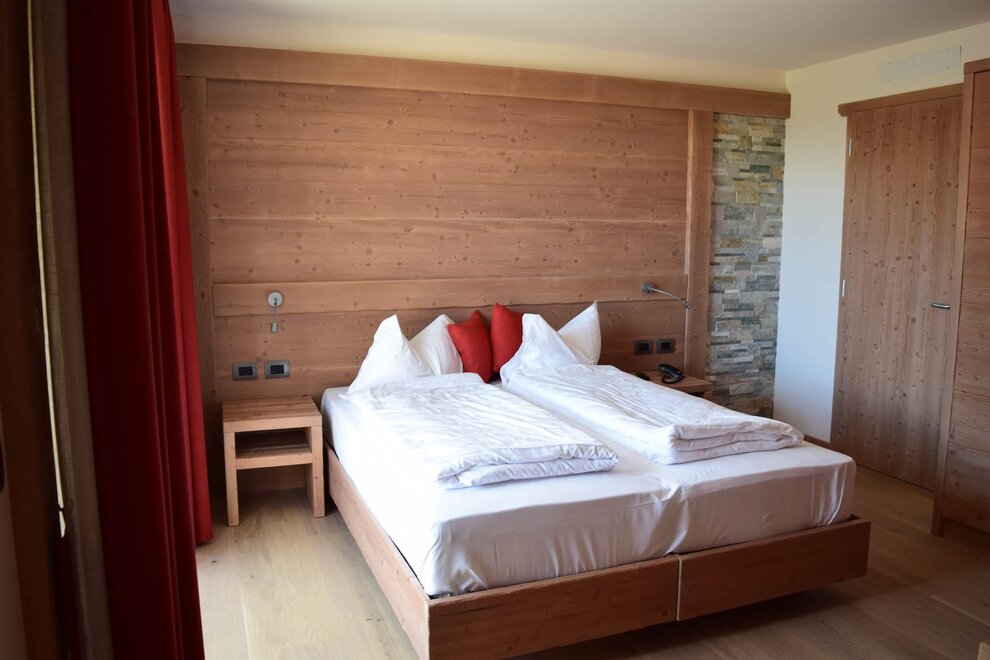 Camera doppia uso singola con vista montagna. Arredamento in legno di abete, dotata di materasso ortopedico, telefono, Wi-fi, TV digitale, telefono, servizi privati con doccia completi di phon, cassetta di scurezza. Alcune stanze dispongono di balcone. Tutte le stanze sono raggiungibili con l'ascensore. Raggiungibile con ascensore e collegata direttamente al centro Wellness.