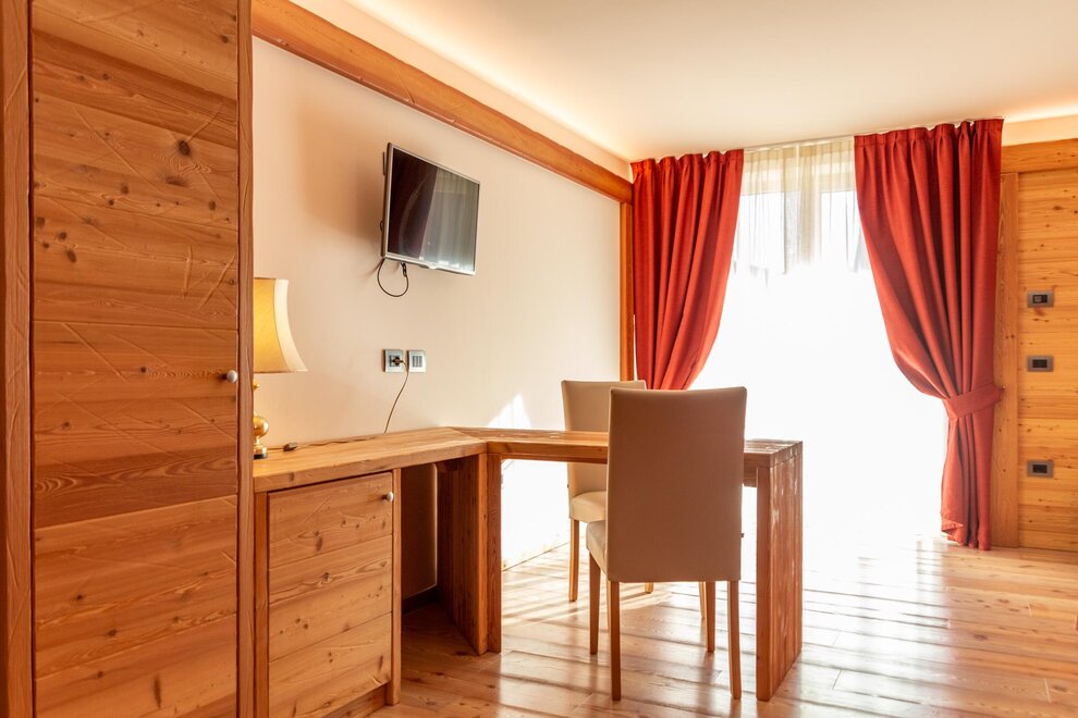 Welcome to the new Junior Suite Room! Relax and enjoy unforgettable moments of wellness. This room is furnished in wood, ideal for a holiday in the pair, equipped with telephone, wi-fi, digital TV, private services with shower hair dryer, safe box and mini-bar. Directly connected to the Wellness Centre by elevator.