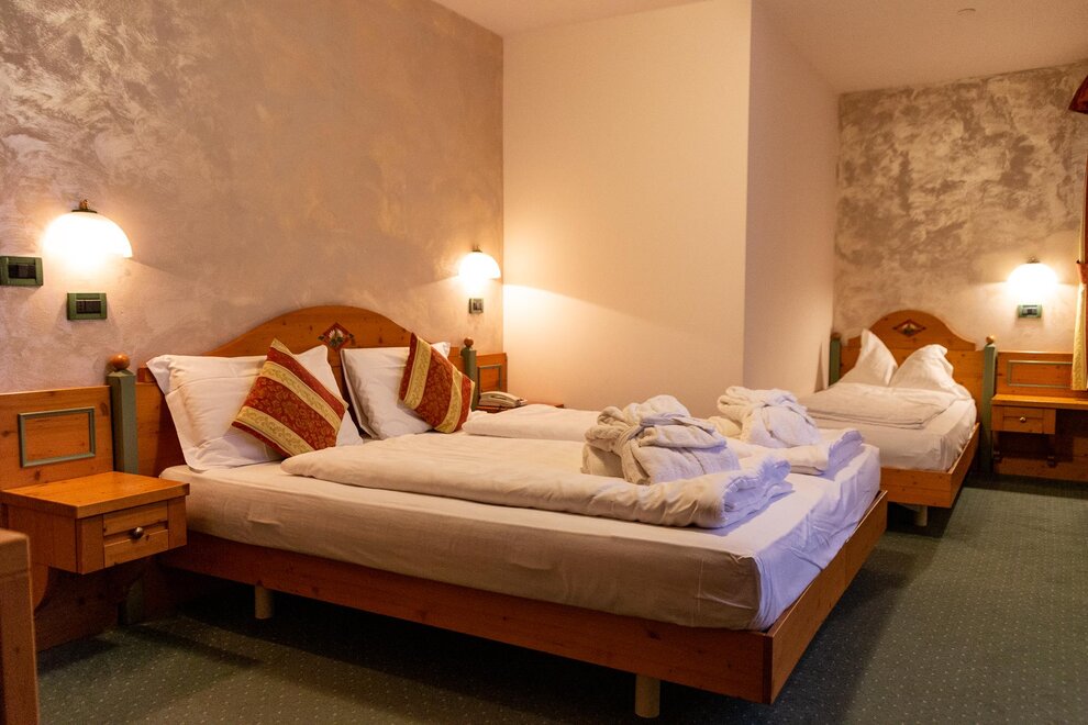 16-24 m² | 1-4 Persone Camera Standard può essere Matrimoniale/Doppia, doppia uso singola, Tripla o Quadrupla con vista montagna. Arredamento in legno di abete, dotata di materasso ortopedico, telefono, Wi-fi, TV digitale, telefono, servizi privati con doccia completi di phon, cassetta di scurezza. Tutte le stanze sono raggiungibili con l'ascensore e collegata direttamente al centro Wellness.