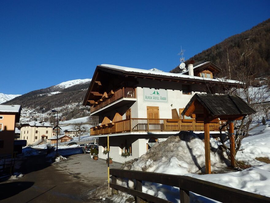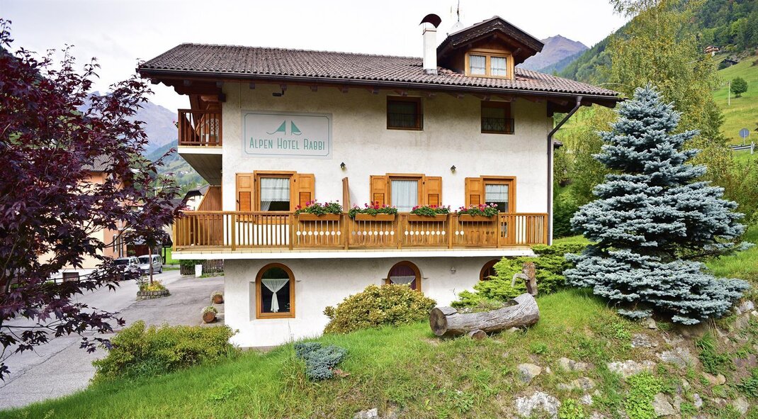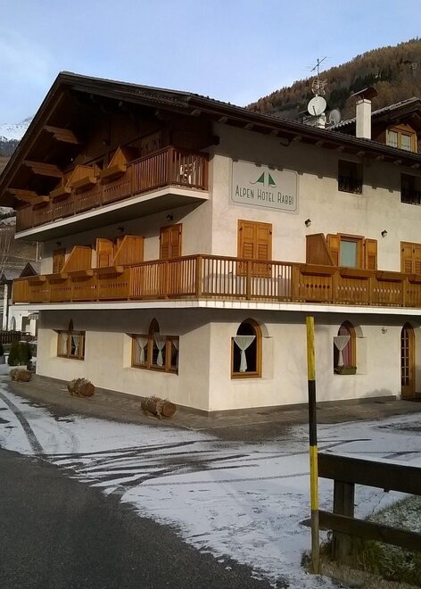 Benvenuti all'Alpen Hotel Rabbi! Piccolo ed accogliente hotel in stile di montagna, dispone di confortevoli camere quasi tutte con balcone panoramico sulle Cascate del Valorz e sulla natura della Val di Rabbi.