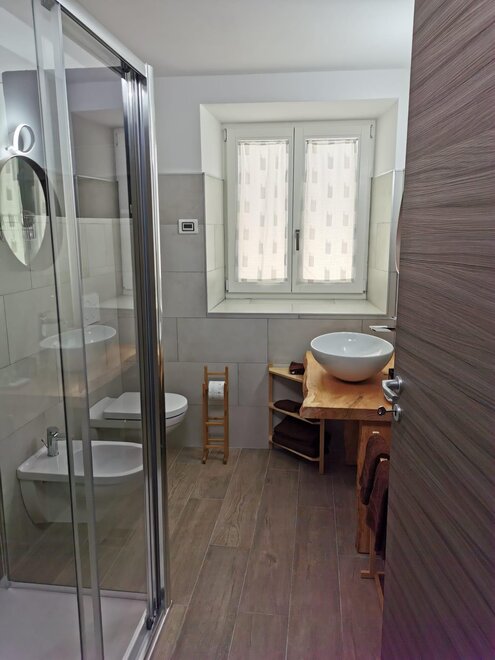 E' un piccolo appartamento al piano terra con ingresso autonomo dalla ampia terazza esposta a sud-est dell'edificio. La cucina è fornita di tutti gli elettrodomestici (frigorifero-congelatore, lavastoviglie, forno,piano ad induzione ,microonde ), angolo relax con smart tv, una camera con un letto matrimoniale e un divanoletto a castello per 2 bambini con ulteriore smart tv,un disimpegno e un bagno con doccia. Tutti i locali sono finestrati. A disposizione per tutti gli appartamenti locale lavanderia con lavatoi, lavatrici ed asse da stiro. Nel locale è anche possibile ricoverare biciclette o altra atrezzatura sportiva.
