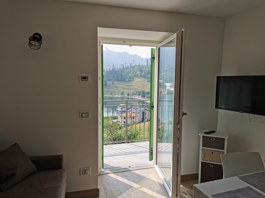 L'appartamento è situato al primo piano, composto ingresso, cucina-soggiorno con un divano letto matrimoniale, smart tv, stanza matrimoniale e ampio bagno con docccia. Dalla cucina e dalla stanza si accede direttamente al terrazzo con vista lago. La cucina dispone di tutti gli elettrodomestici di ultima generazione. L'appartamento può ospitare fino a quattro persone. A disposizione per tutti gli appartamenti locale lavanderia con lavatoi, lavatrici ed asse da stiro. Nel locale è anche possibile ricoverare biciclette o altra atrezzatura sportiva.