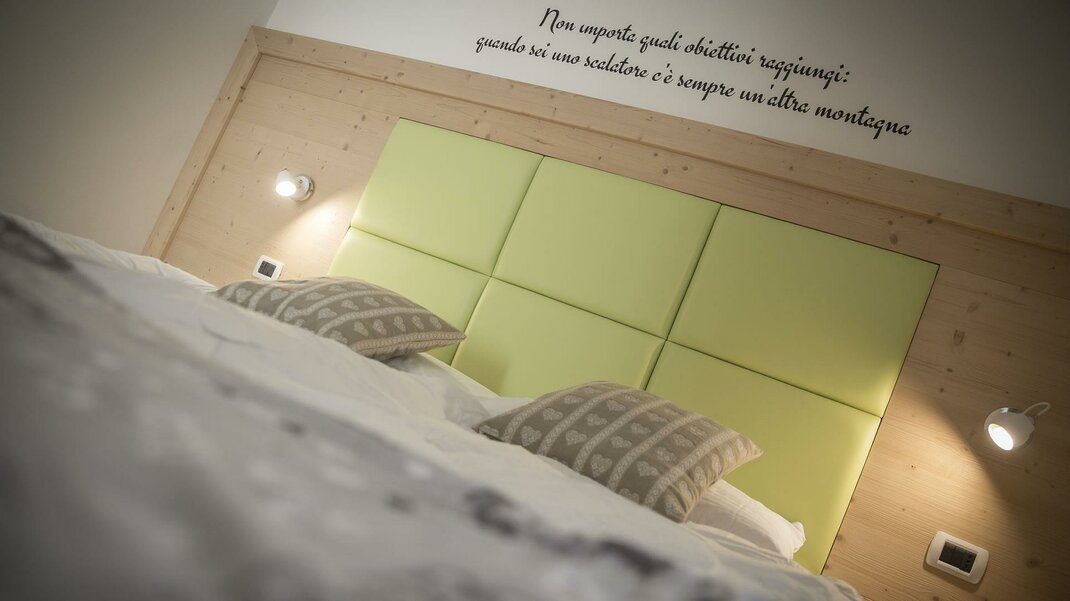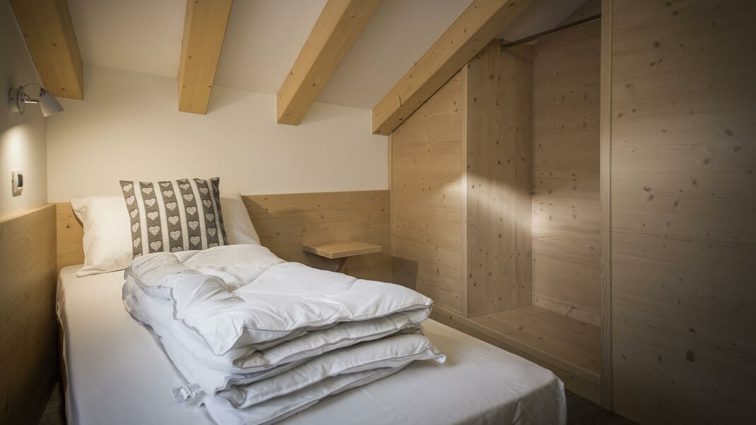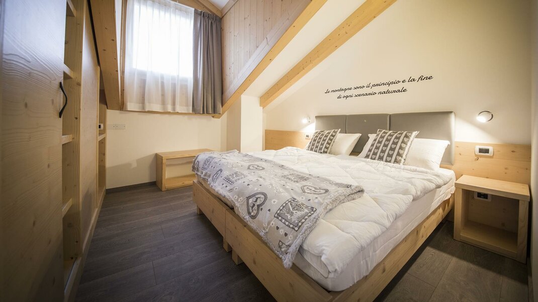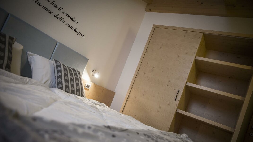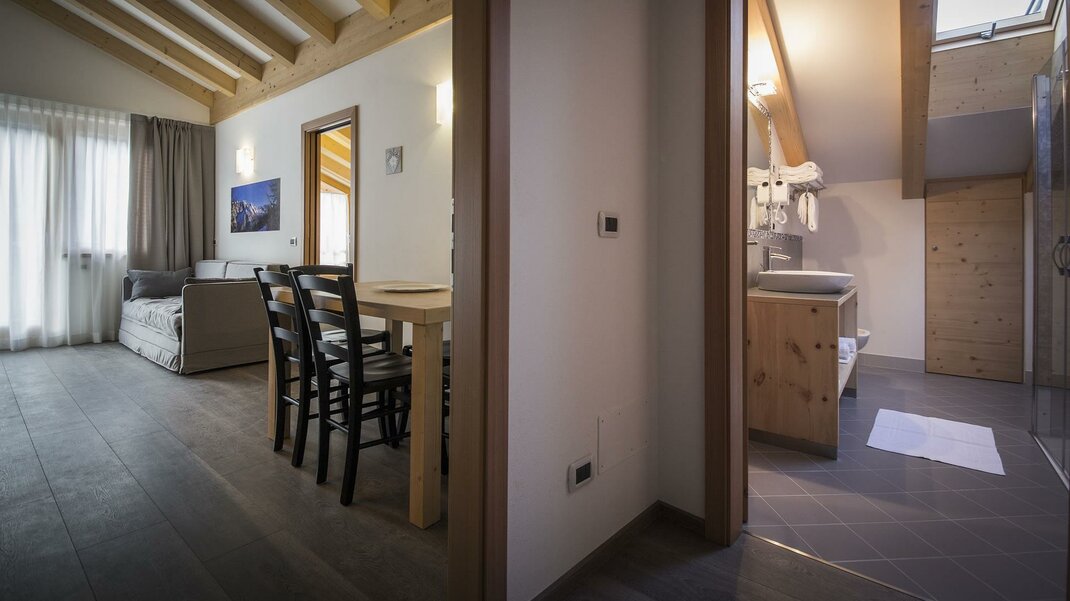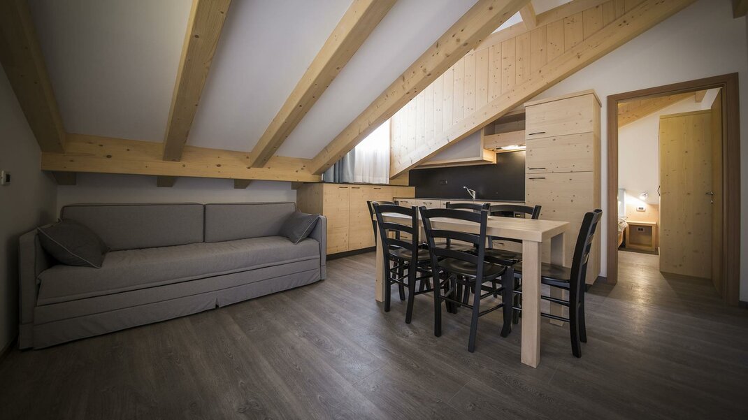Abbiamo scelto il massimo nelle finiture per realizzare un ambiente moderno, funzionale, ma “dal sapore di montagna”; tutti i nostri appartamenti sono realizzati in stile unico, utilizzando materiali tipici di montagna di grande pregio. I nostri suite - appartamenti sono forniti di stoviglie e biancheria da letto, da bagno e da cucina. Appartamento di Mq 54. Adatto ad ospitare fino a 6 persone. In mansarda con travi a vista: due camere doppie, bagno completo, cucina-soggiorno con divano letto, balcone panoramico con vista su tutta la valle.
