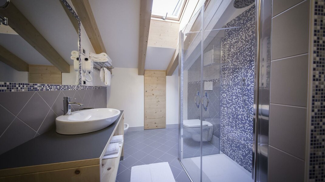 Abbiamo scelto il massimo nelle finiture per realizzare un ambiente moderno, funzionale, ma “dal sapore di montagna”; tutti i nostri appartamenti sono realizzati in stile unico, utilizzando materiali tipici di montagna di grande pregio. I nostri suite - appartamenti sono forniti di stoviglie e biancheria da letto, da bagno e da cucina. Appartamento di Mq 40. Adatti ad ospitare fino a 5 persone. In mansarda con travi a vista: camera tripla, bagno completo, cucina-soggiorno con divano letto, balcone.