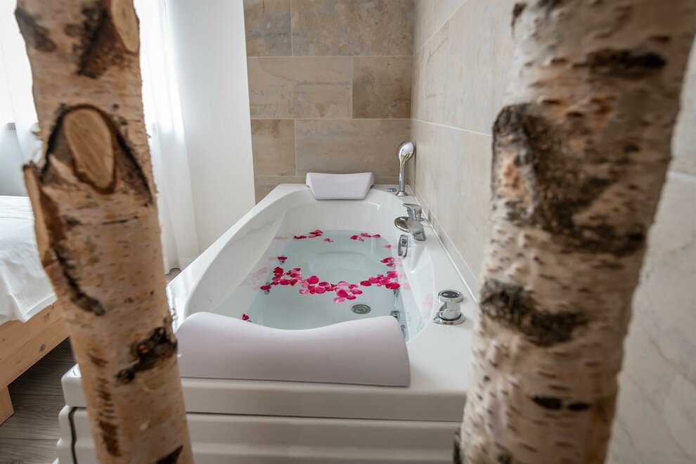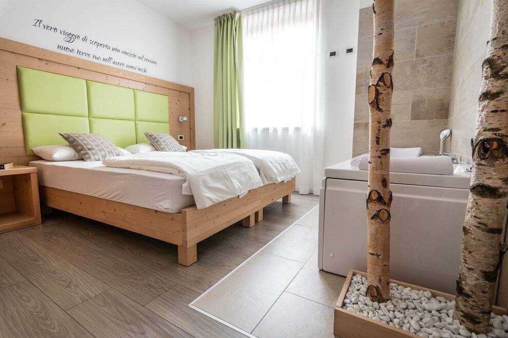 Camera da letto matrimoniale in legno di abete naturale, armadio con cassaforte, smart TV e vasca idromassaggio,