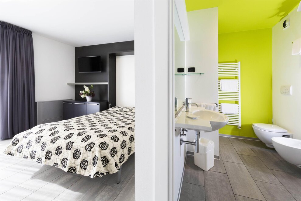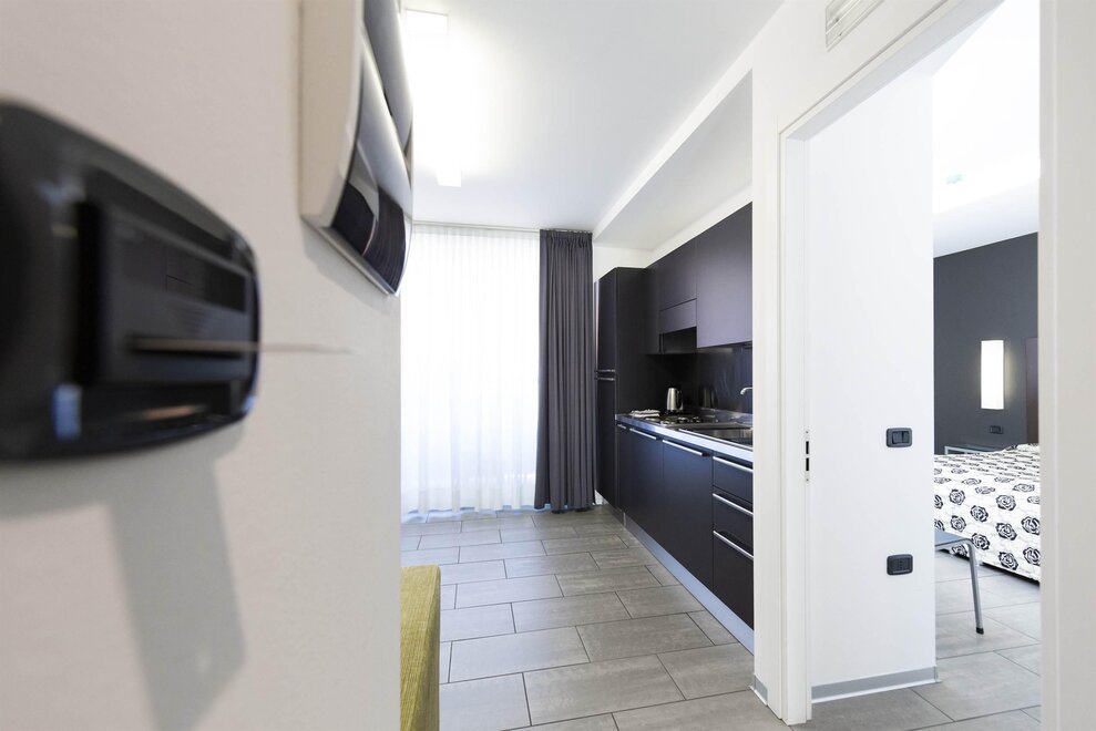 appartamento senza moquette, camera/app. per famiglie, climatizzatore, WiFi, prodotti bagno, pulizia infrasett. solo su richiesta - a pagamento, piumone, pavimento in piastrelle o marmo, wi-fi gratis, riscaldamento, arredamento moderno, piatti e posate, soggiorno, TV-Sat, biancheria tavola-cucina, essenziali (Asciugamani, lenzuola, sapone e carta igienica), angolo cottura, biancheria da bagno, biancheria da letto, macchina caffè, congelatore a disposizione, cassetta sicurezza, bollitore acqua, rilevatore di fumo, asciugacapelli, utensili da cucina, biancheria fornita , frigorifero, balcone, camere da letto separate: 1