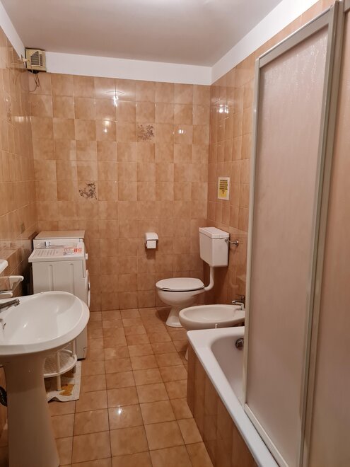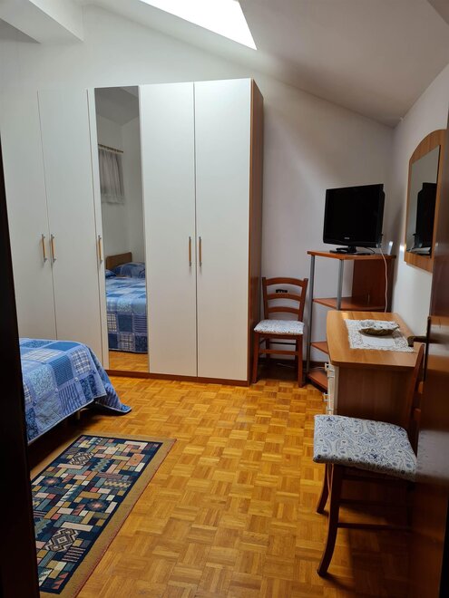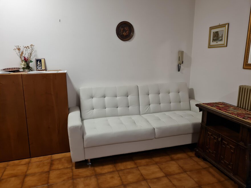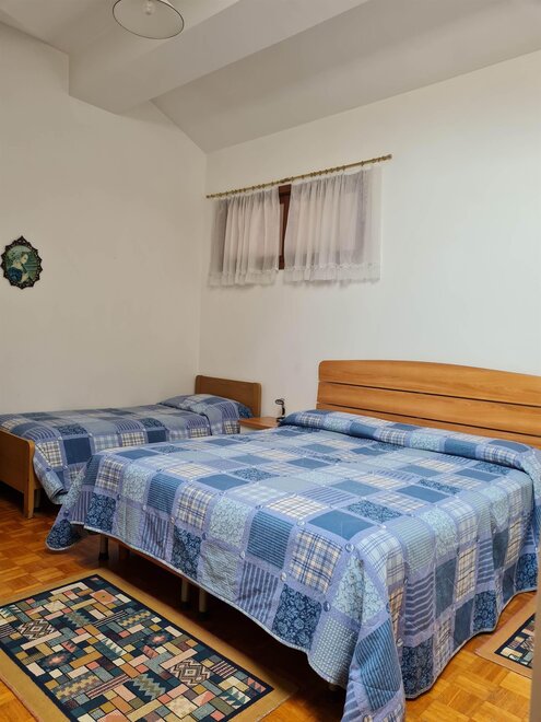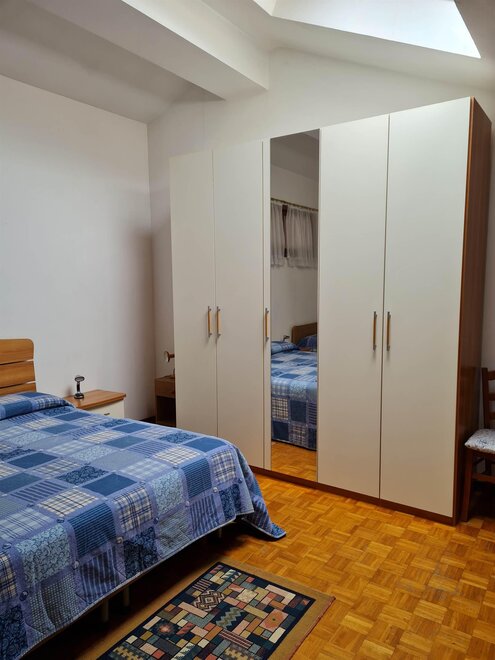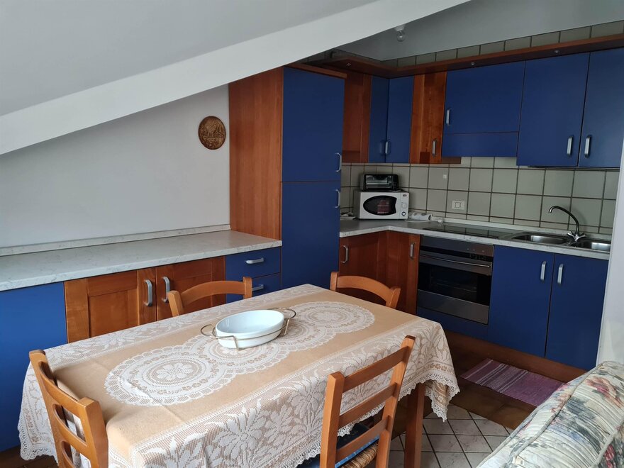 Appartamento per vacanze al terzo piano di 75 mq composto da zona giorno con cucina e soggiorno con divano letto (con secondo letto estraibile) e zona notte con una camera matrimoniale e un letto singolo. L'appartamento è dotato di TV, forno, forno a microonde, frigorifero, piano cottura a induzione, aspirapolvere, ferro e asse da stiro, lavatrice, asciugacapelli, cantina, riscaldamento, balcone, cortile, posto macchina all’aperto, garage, ascensore, biancheria su richiesta (per camera e per bagno).