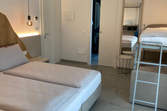 La camera è dotata di un comodo letto matrimoniale e un pratico letto a castello, una combinazione perfetta che ottimizza lo spazio garantendo un riposo confortevole per quattro ospiti. Il bagno privato con doccia, la connessione Wi-Fi e l'aria condizionata completano l'offerta di questa stanza luminosa.