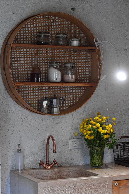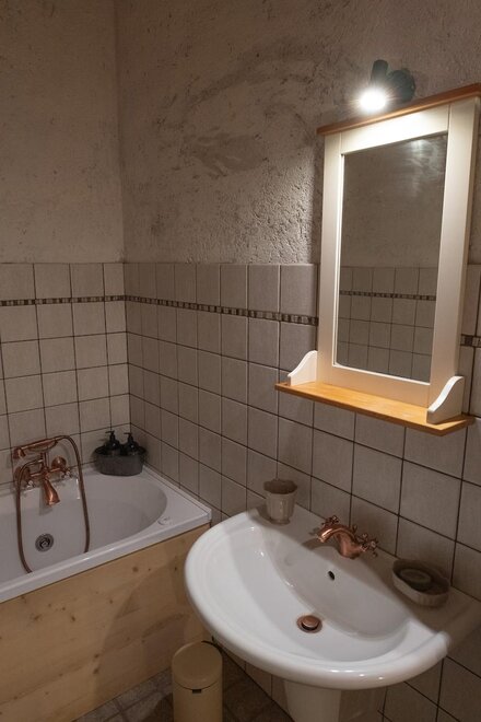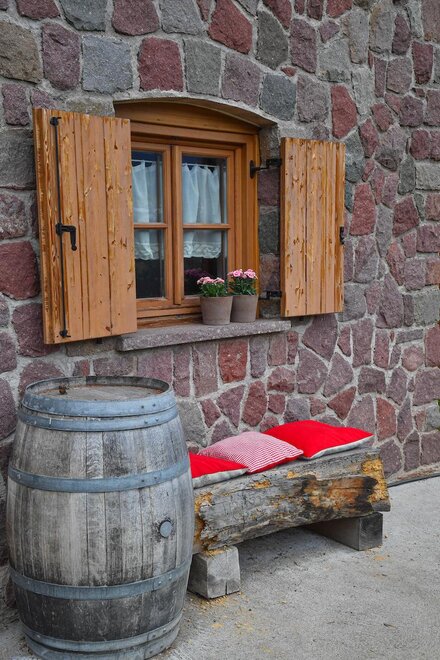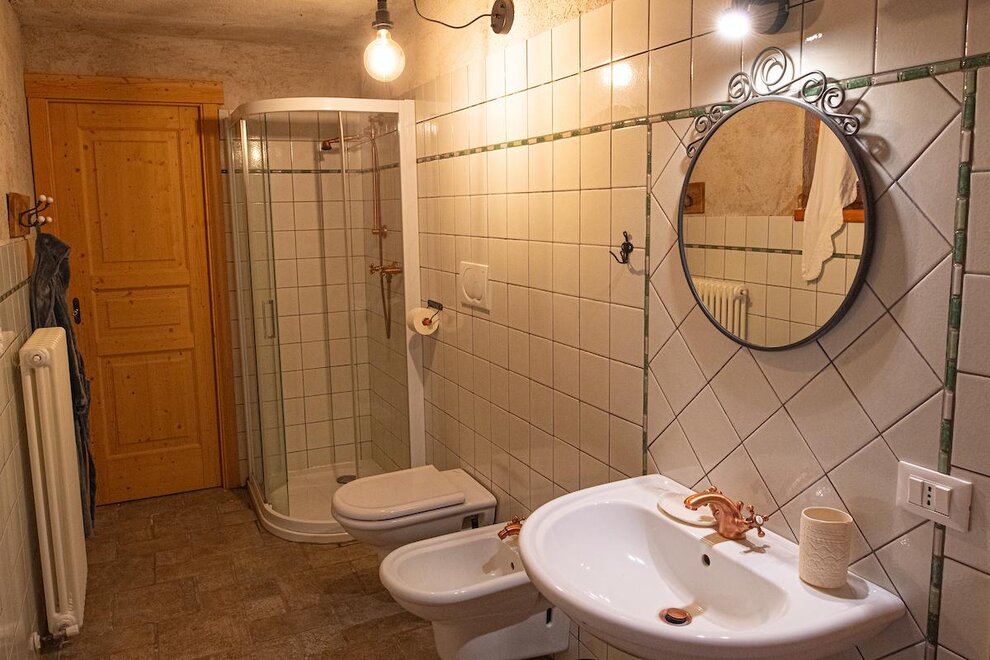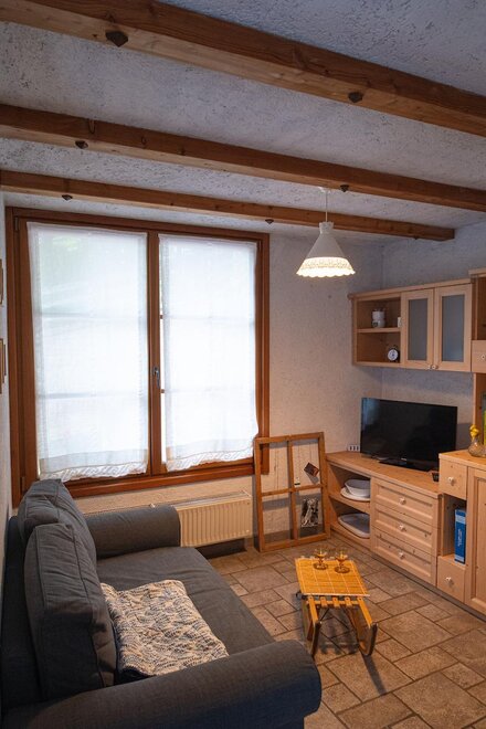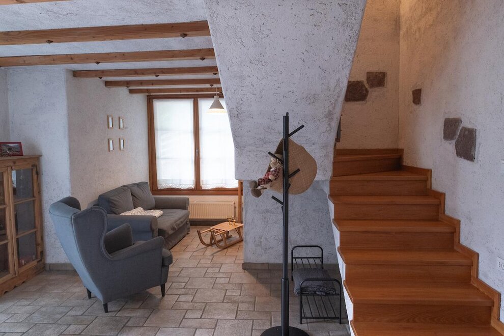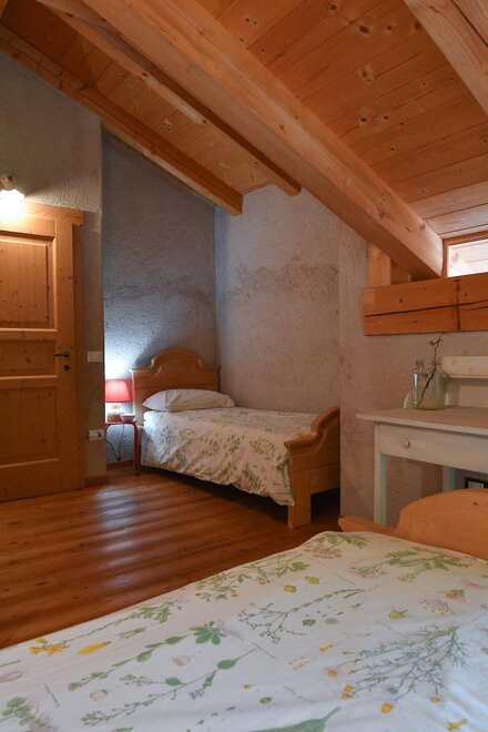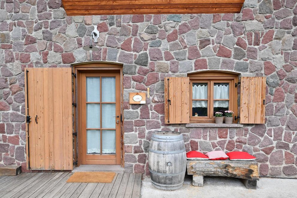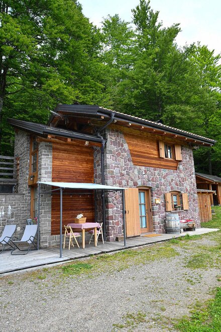La baita è totalmente ristrutturata, si presenta con le caratteristiche tipiche delle vallate alpine, in legno e sasso. I materiali usati sono esclusivamente naturali, reperiti in loco. L’abitazione è disposta su due piani. Di fronte all’antica fontana del pascolo si accede al soggiorno, confortevole zona relax da cui si può godere della vista del bosco di faggi. Sempre a piano terra si trova la spaziosa cucina con stufa a legna, finemente arredata con mobili rustici appartenenti all’antico maso risanati ed adattati, ed una piccola cantina. Al piano superiore due stanze di cui una matrimoniale, la cui finestra gode della vista di tutta la valle. La seconda stanza è molto amplia dotata di due letti singoli ha parete finestrata attentamente progettata per permette una fusione fra bosco esterno e ambiente interno.