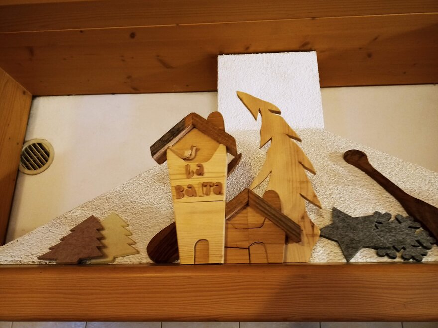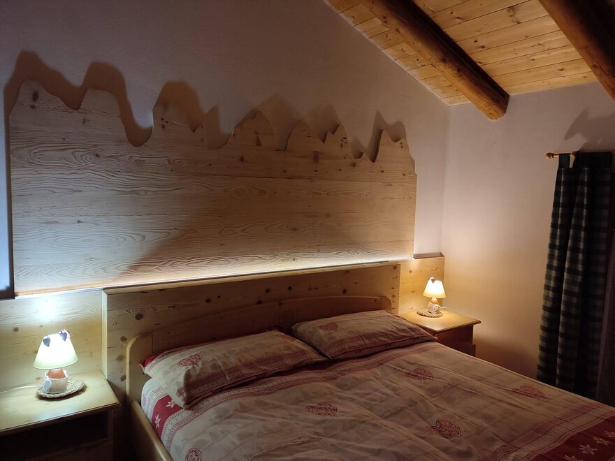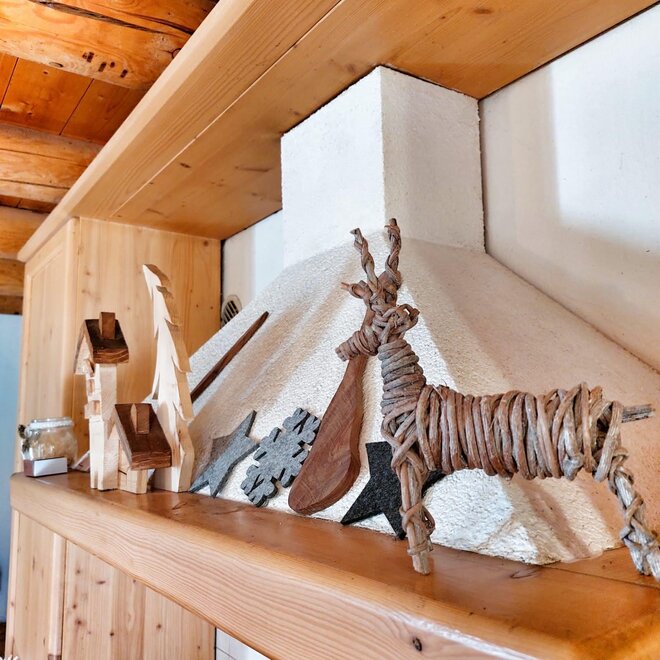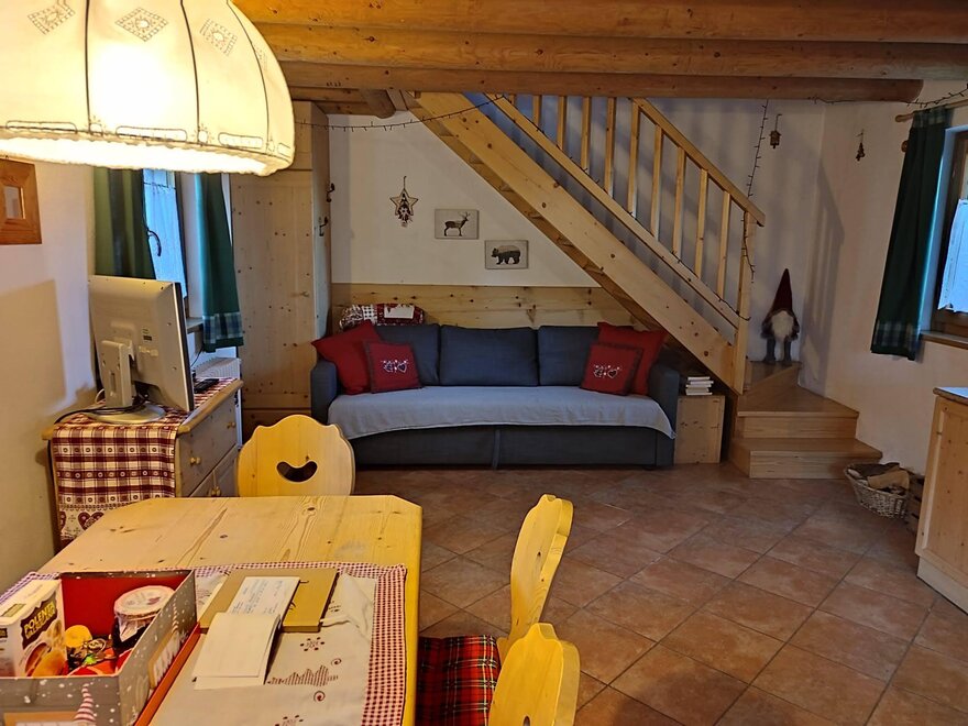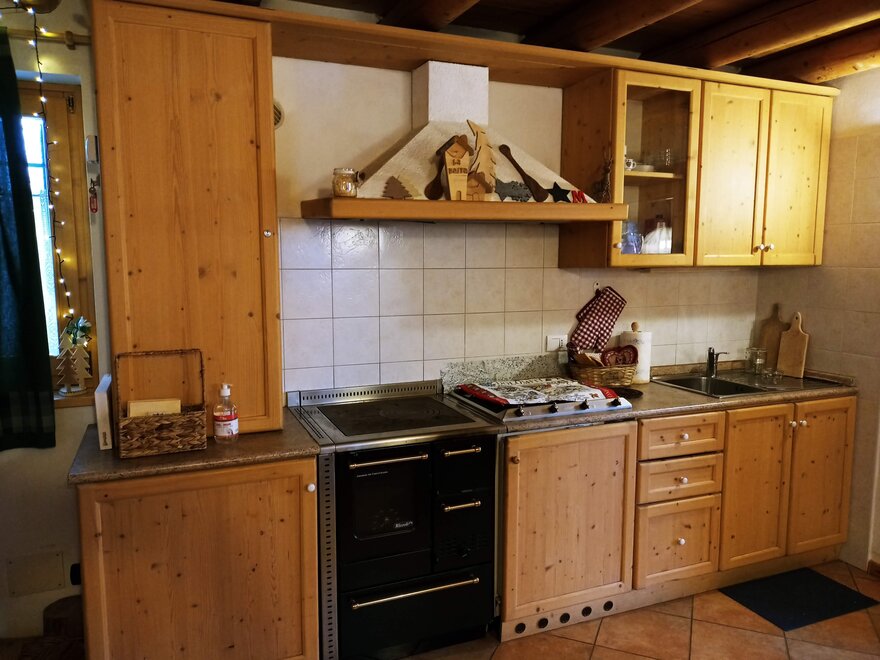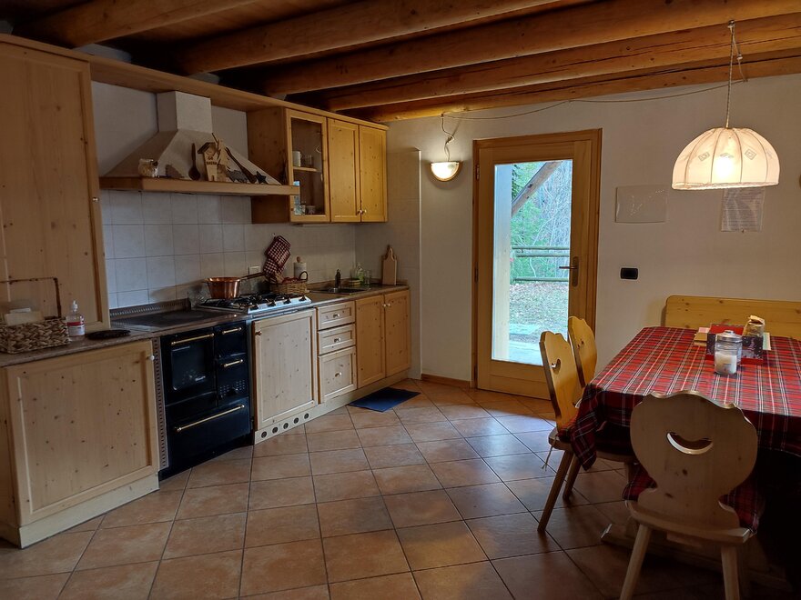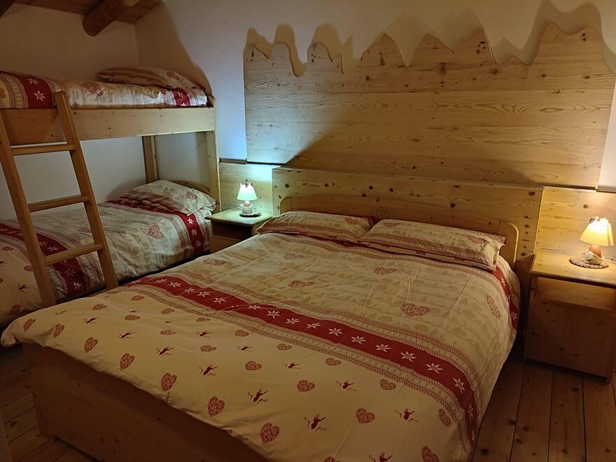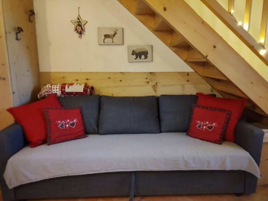 La nostra baita in affitto in montagna è unifamiliare, dispone di una grande sala/cucina con cucina a gas e cucina domestica a legna ed è disposta su due piani. Al piano sopra dispone di una camera matrimoniale con un letto a castello ed un bagno con doccia. Nella sala cucina c'è un divano letto matrimoniale.