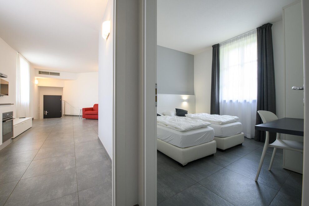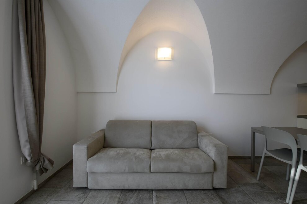 Appartamento con una camera doppia ed un divano letto in soggiorno.