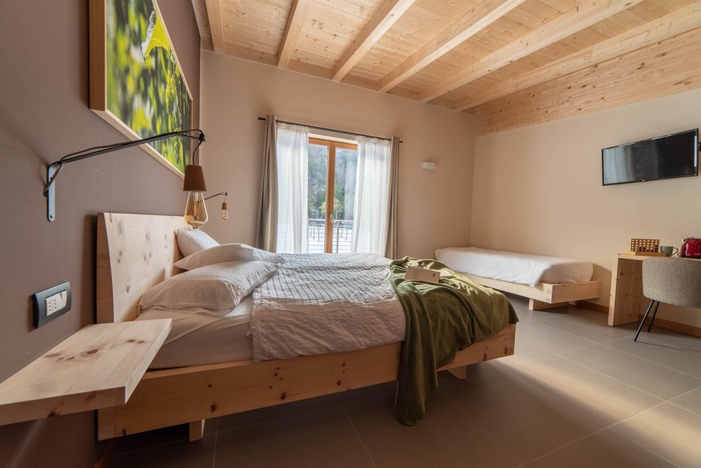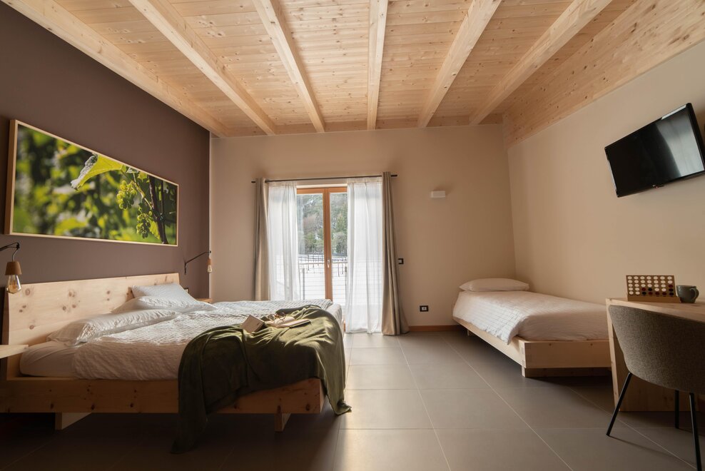 Camere con accesso indipendente al piano terra dove trovate un letto matrimoniale Extra Large e letto singolo aggiuntivo. Gli arredi in pregiato legno di cirmolo diffondono un profumo magico e rilassante. Sono dotate di TV, frigo, asciugacapelli e connessione Internet Wi-Fi. Si affacciano direttamente sul giardino con vista vigneto, tavolino e comode sedie relax. Ideali per sportivi e per chi soggiorna accompagnato dall’amico a 4 zampe.