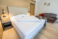 Le stanze, recentemente rinnovate, sono arredate in stile alpino, con presenza di parquette,Tv a schermo piatto 32 pollici, dotate tutte di bagno con doccia e di balcone con vista sia quelle situate davanti, sia quelle sul retro