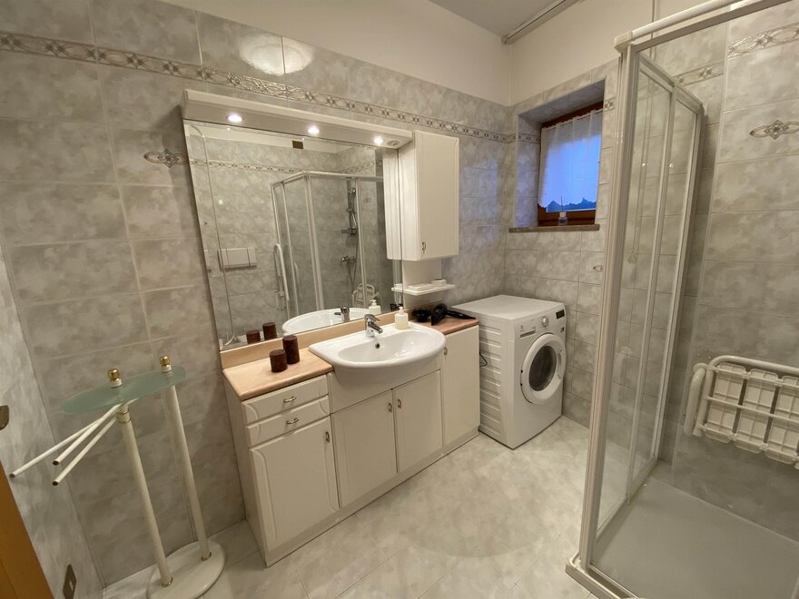 Il bagno è ampio con doccia, wc, bidet ed è fornito di lavatrice, asciugatrice e asciugacapelli disponibili per gli ospiti.