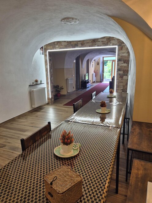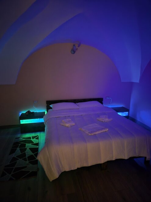 Casa rinnovata nel borgo di Cares, dove il carattere delle pareti e delle volte in pietra incontra arredi essenziali e dettagli curati. Gli ambienti sono ariosi e luminosi di giorno; la sera l’illuminazione calda crea un’atmosfera raccolta e rilassante. La zona living dialoga con l’area pranzo e con la cucina attrezzata, pensata per vivere la casa in modo semplice e funzionale.