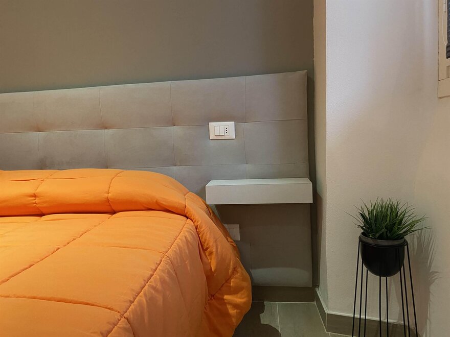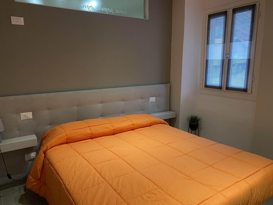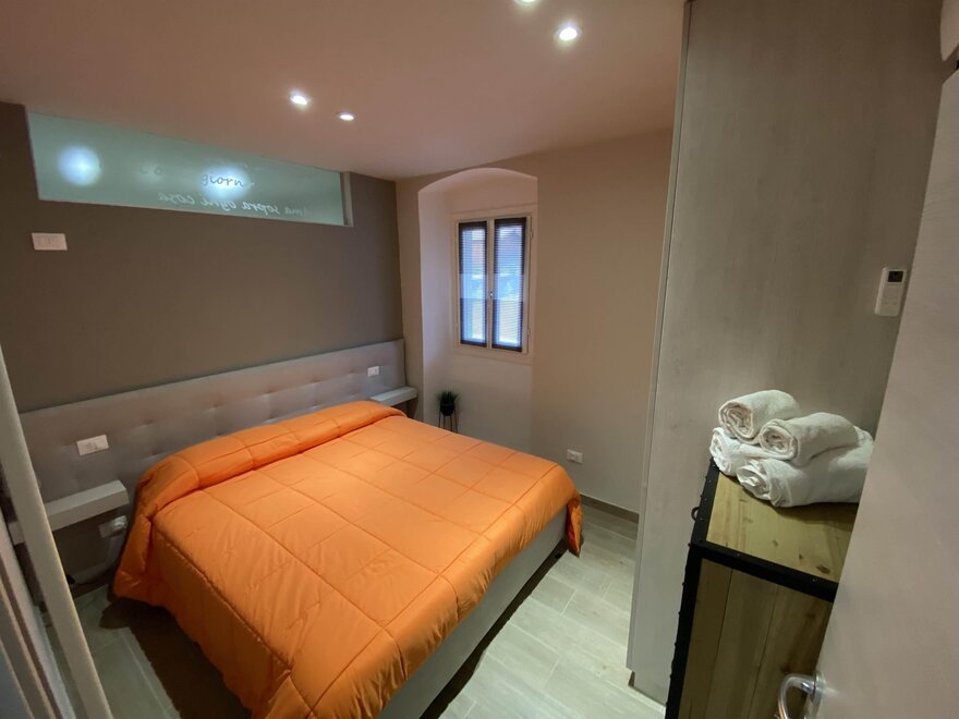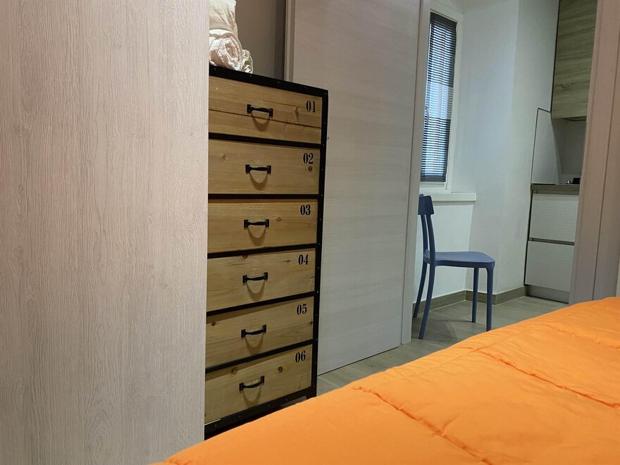 Camera da letto matrimoniale con cassone contenitivo, ampio armadio a tutta altezza e cassettiera settimanale. Bagno con lavello, vaso ed ampia doccia.