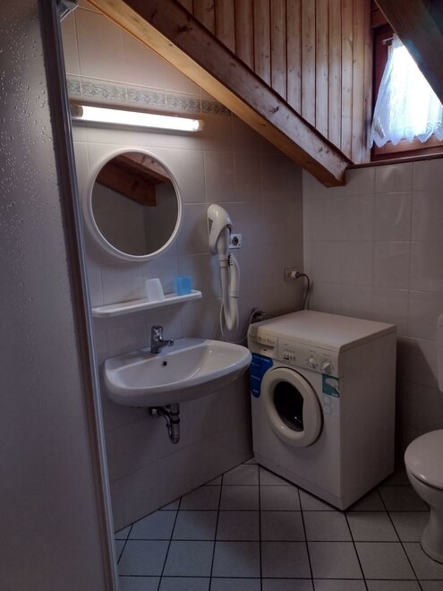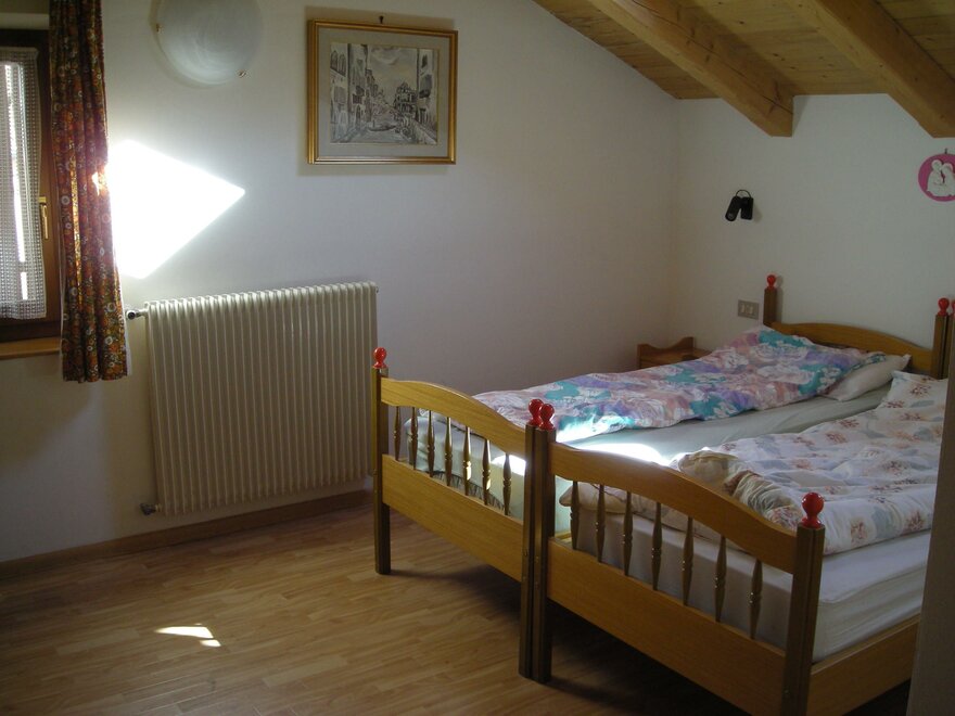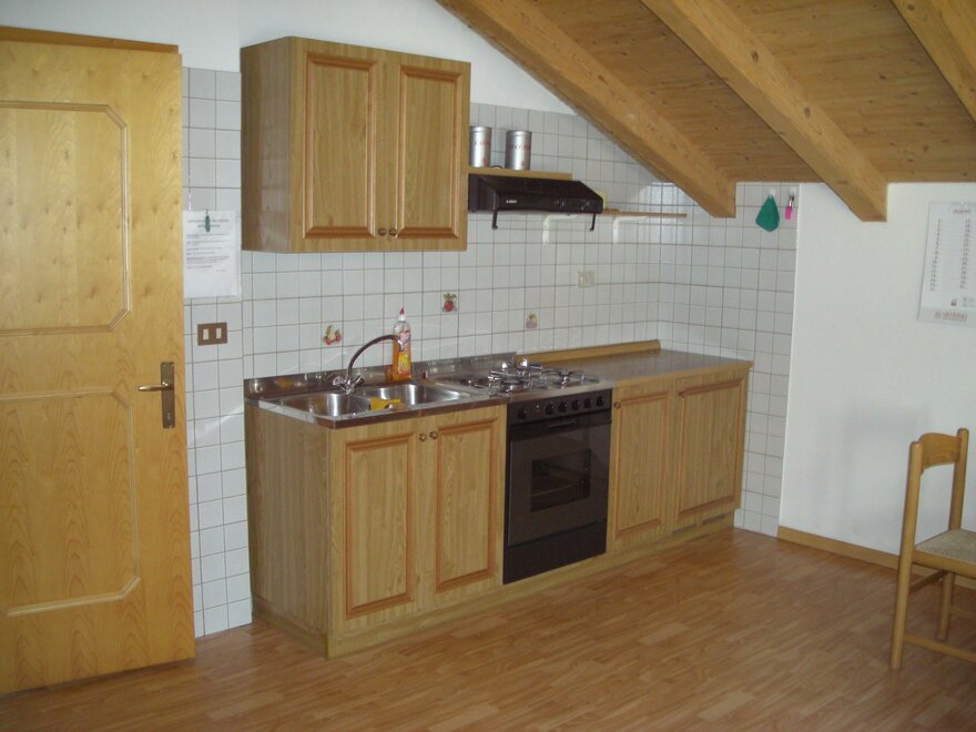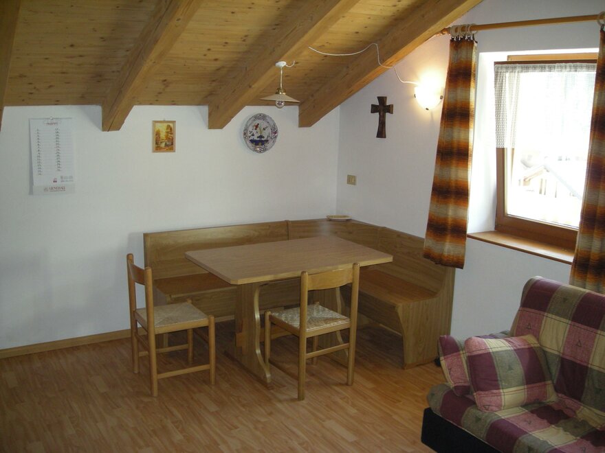 Appartamento situato al primo piano, mansardato, composto da soggiorno con angolo cottura, divano letto, bagno, camera da letto matrimoniale. Parcheggio privato, skiroom, giardino privato (attrezzato durante la stagione estiva), wifi gratuito, lavatrice. Si accettano animali.