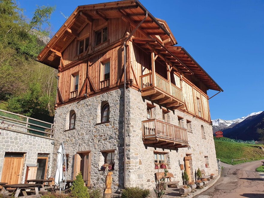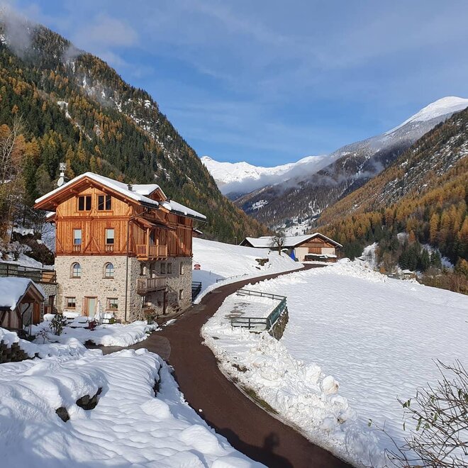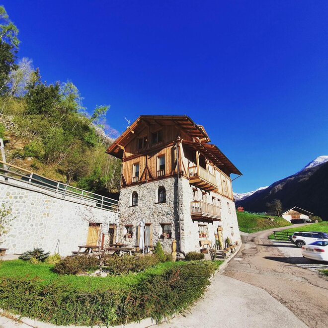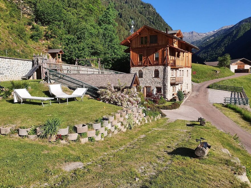Tipico maso alpino alle porte del Parco dello Stelvio con splendida vista sulla Valle di Rabbi. Nuovissimo e bellissimo con stanze spaziose e luminose con rivestimenti e pavimenti in larice, mobilio di pregio, materassi,doghe e piumini di grande qualità Tv/Lcd, internet wireless, bar, ristorante, solarium, giardino, parco giochi bambini, garage, deposito attrezzatura e tanto altro. Cucina particolarmente curata dai proprietari(cuoco e pasticcera) colazione con ricchissimo buffet (torte fatte in casa, biscotti, confetture, miele...)e gustose cene.