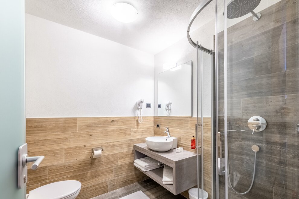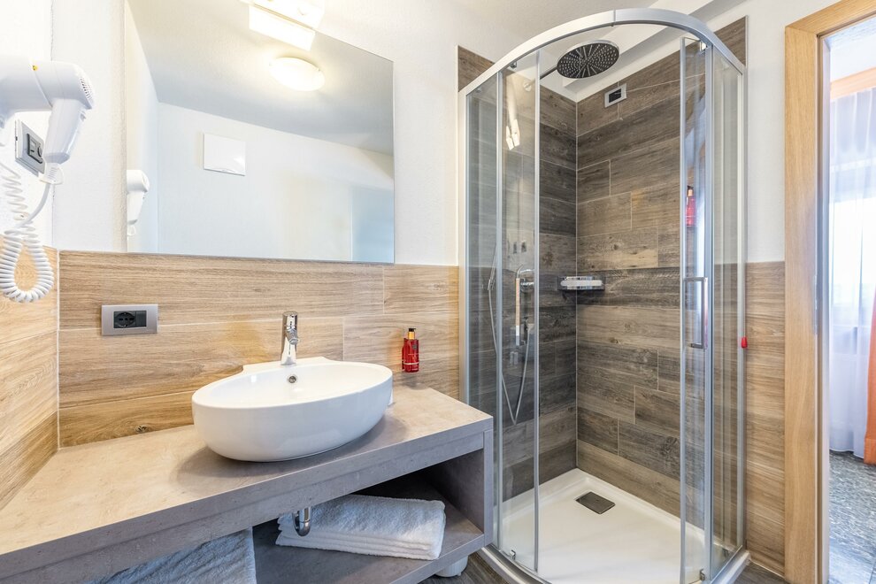 Camera arredata in profumato legno cirmolo con vista sul Sass Pordoi e dotata di bagno privato interno con bidet, doccia e set di cortesia, bollitore per tè e caffè, scrivania, cassaforte, connessione Wi-Fi gratuita e TV a schermo piatto con canali satellitari. Al momento della prenotazione siete pregati di specificare la tipologia di letto desiderata.