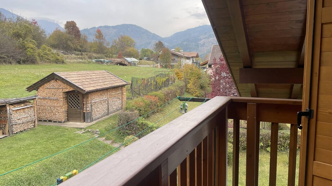 Due balconi panoramici offrono viste diverse e suggestive, uno rivolto verso il paese, l’altro affacciato su prati, boschi e montagne che circondano la casa, regalando un’atmosfera serena e autentica tipica della Val di Fiemme.