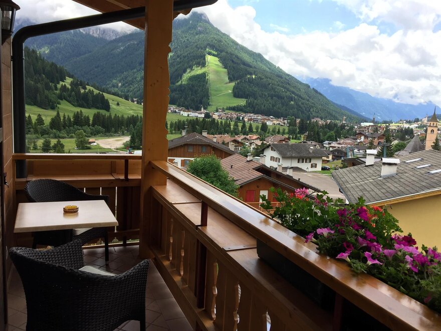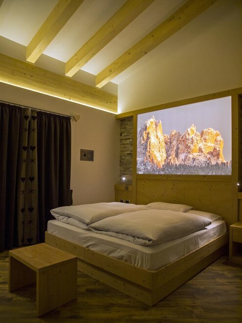La suite romantic di ca. 40mq è composta da piccolo angolo con stube ladina, frigo bar, televisore a schermo piatto, divano, cassaforte, ampio balcone con vista sulle più belle cime,