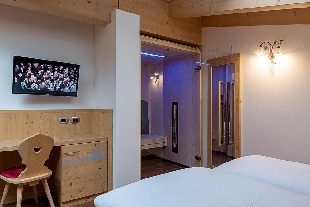 Junior suite wellnessdi ca. 40mq è composta su 2 livelli, piano terra con soggiorno con stube ladina, frigo bar, televisore a schermo piatto , divano, cassaforte,balcone ed ampio bagno. Al piano rialzato troviamo la zona notte con televisore, cabina ad infrarossi , telefono e divano. Tutta la camera è con collegamento wi-fi gratuito e pavimento in parquet.
