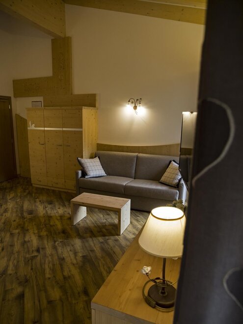 La junior suite Ladina di ca. 40mq è divisa su 2 livelli, al piano terra troviamo il soggiorno con stube ladina, frigo bar, televisore, divano, cassaforte,balcone ed ampio bagno.