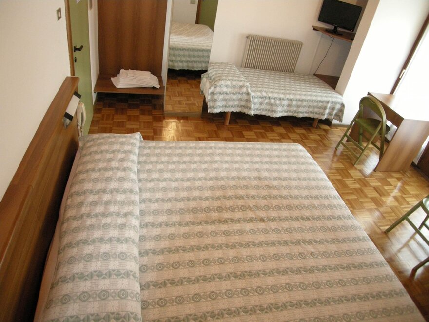 Camera con letto matrimoniale più letto singolo . Camera in stile alpino con pavimento in parquet , balconcino , servizi privati , asciugacapelli, TV , cassetta di sicurezza , Internet Wi-Fi