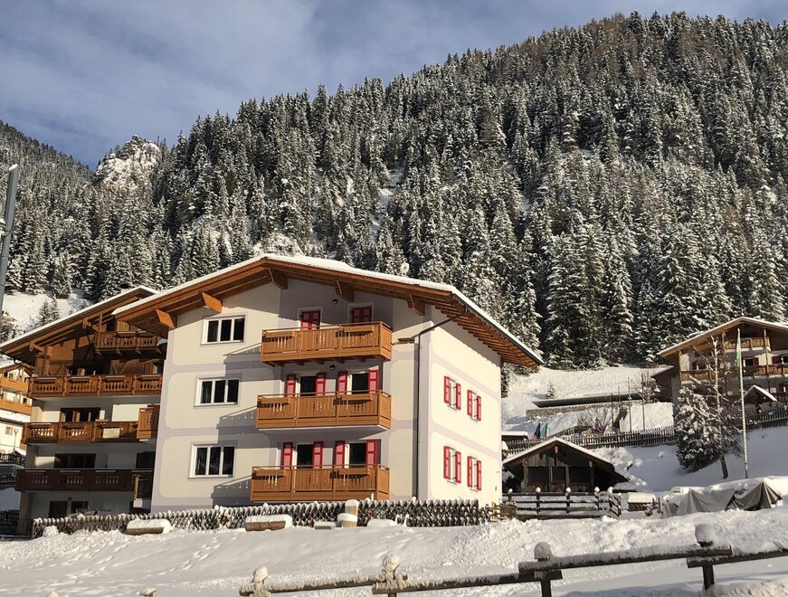La casa si trova nella parte iniziale del paese di Canazei, sulla strada principale, a poca distanza dalla chiesa parrocchiale del Sacro Cuore.