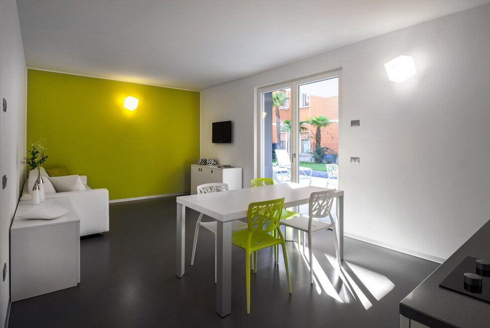 Tutti gli appartamenti dispongono di lavastoviglie, piastre ad induzione, forno microonde, frigo e freezer, riscaldamento, aria condizionata, Sat-TV, cassaforte, phon e balcone o terrazzo.Un bilocale composto da una camera da letto con letto matrimoniale, un bagno con doccia, soggiorno con divano letto matrimoniale e cucina completamente attrezzata.