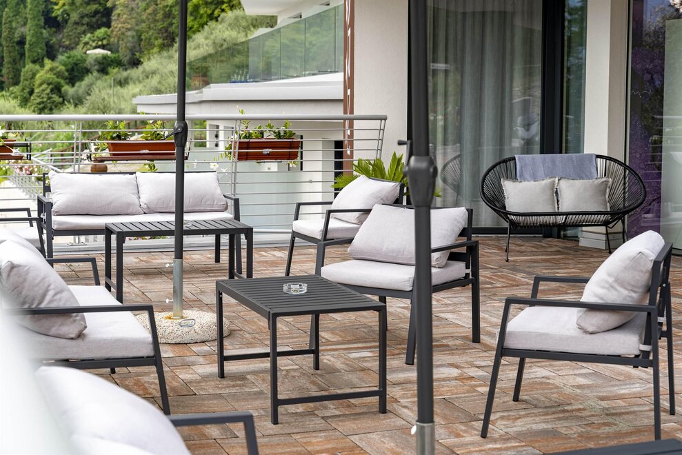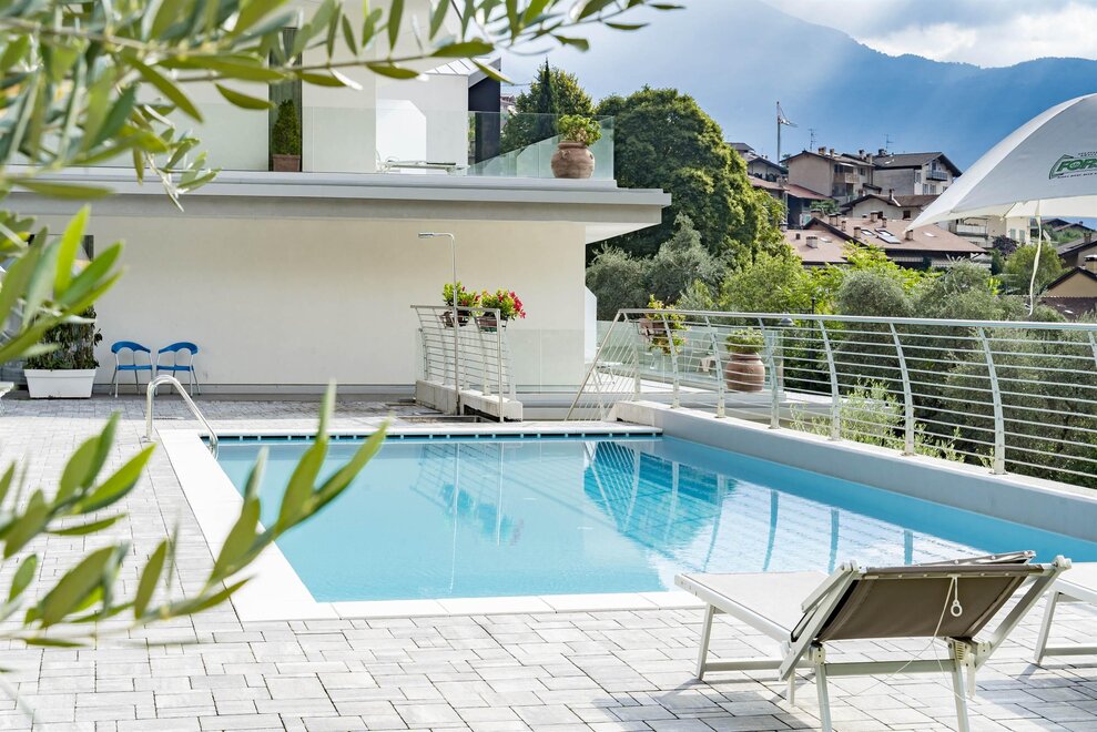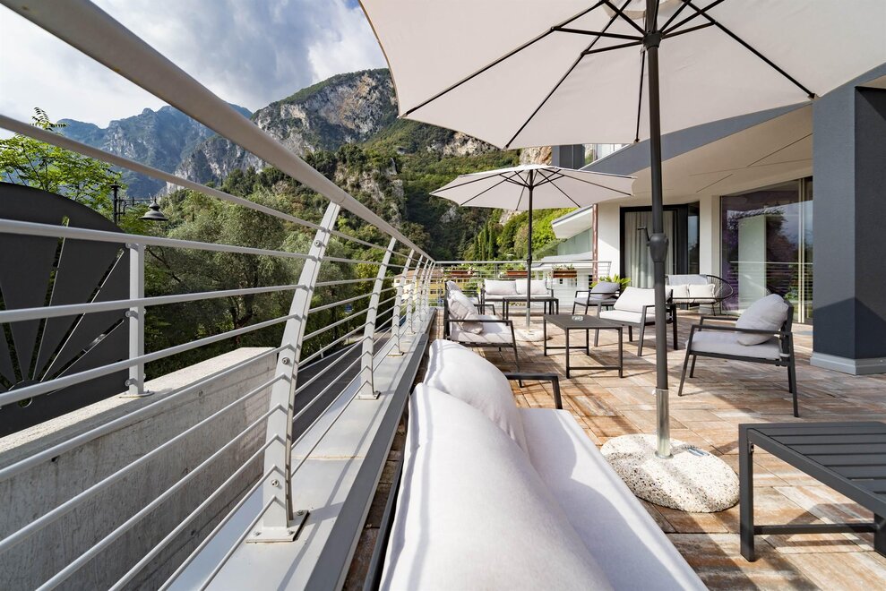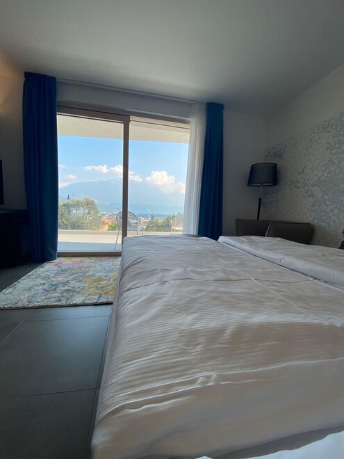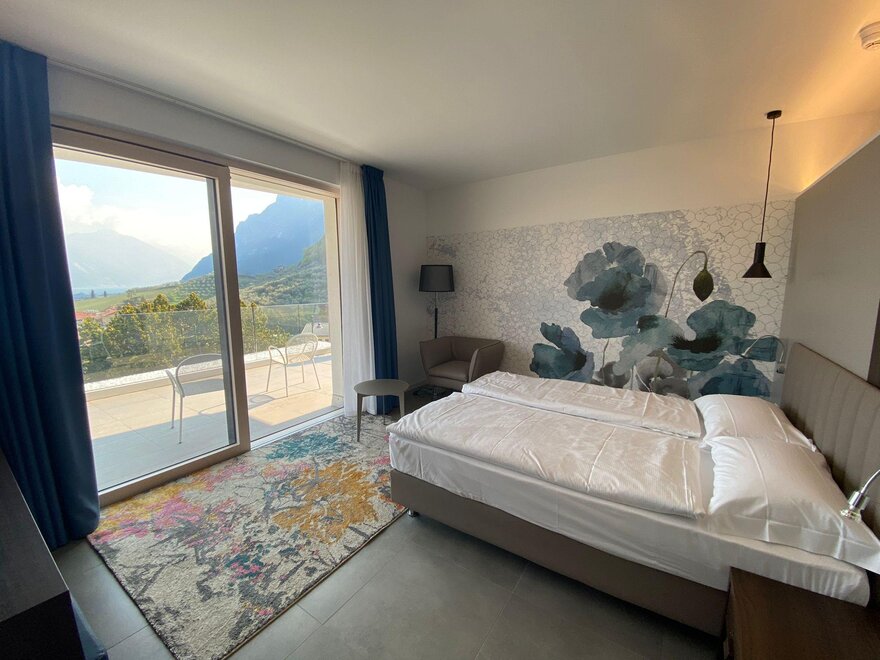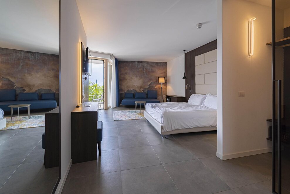 Camera in stile moderno con vista sul Lago di Garda o sulla piscina, ideale per le coppie. Questa tipologia di camera, essendo più spaziosa, dispone di una cambina armadio e di un letto matrimoniale non separabile. Le suite sono dotate di connessione Wi-Fi gratuita, TV satellitare a schermo piatto, minibar, cassaforte, scrivania, riscaldamento, aria condizionata, balcone, bagno privato completo di asciugacapelli e set di cortesia.