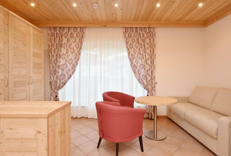 Le nostre Junior Suite in legno d'abete sono situate in mansarda, hanno il tetto a vista e danno quel senso di calore tipico degli chalet di montagna! Sono camere spaziose dotate di servizi privati con doccia e asciugacapelli, terrazzino in legno di larice, angolo salotto con due poltrone e tavolino, Tv a schermo largo, cassaforte, telefono e Wi-Fi gratuito!
