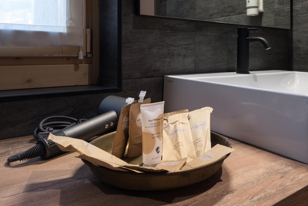 - Nessun contenitore di plastica per shampoo, gel doccia, e articoli da toeletta offerti