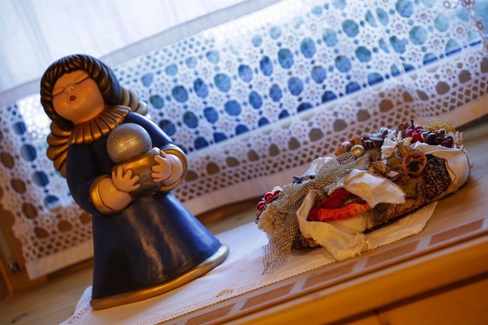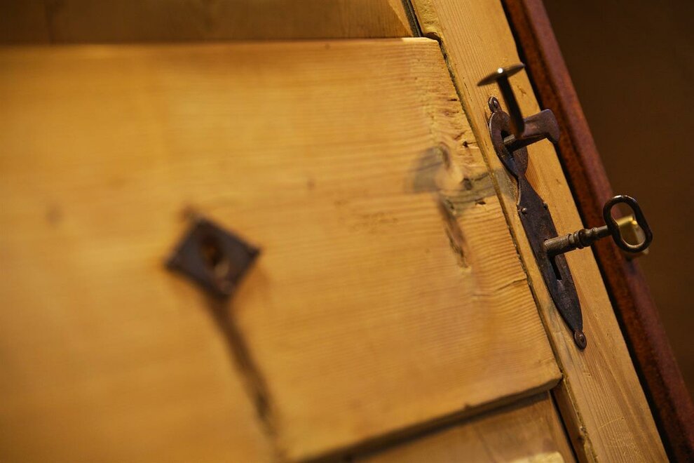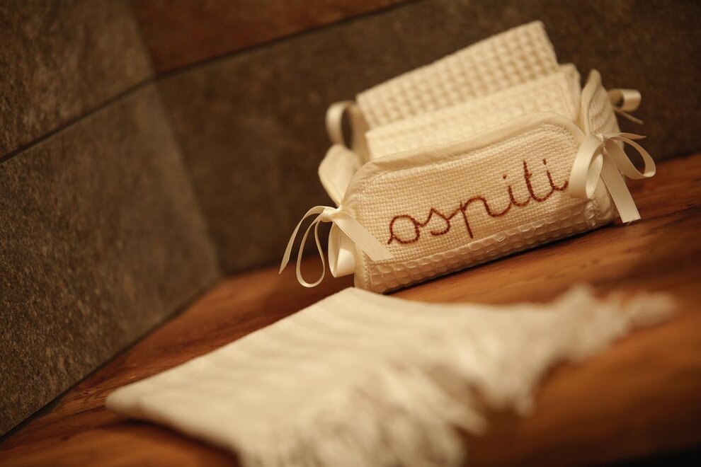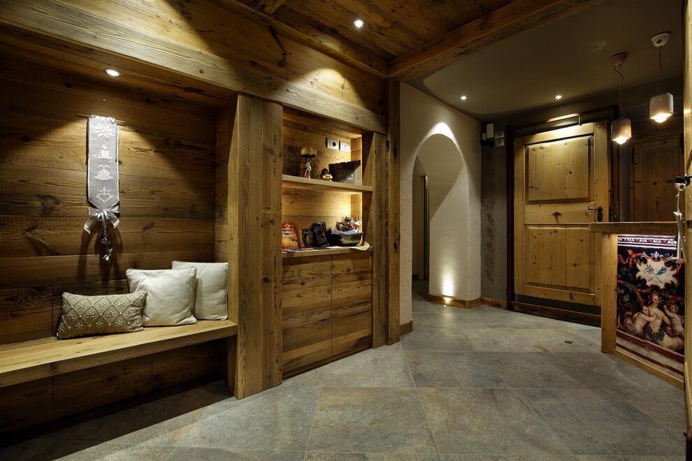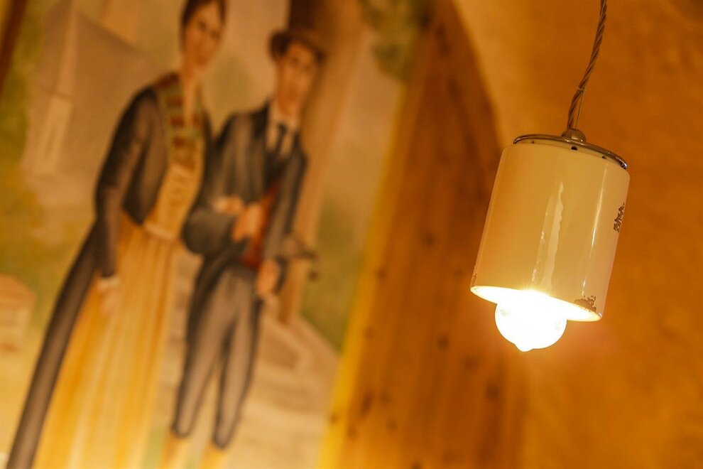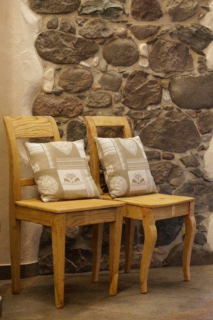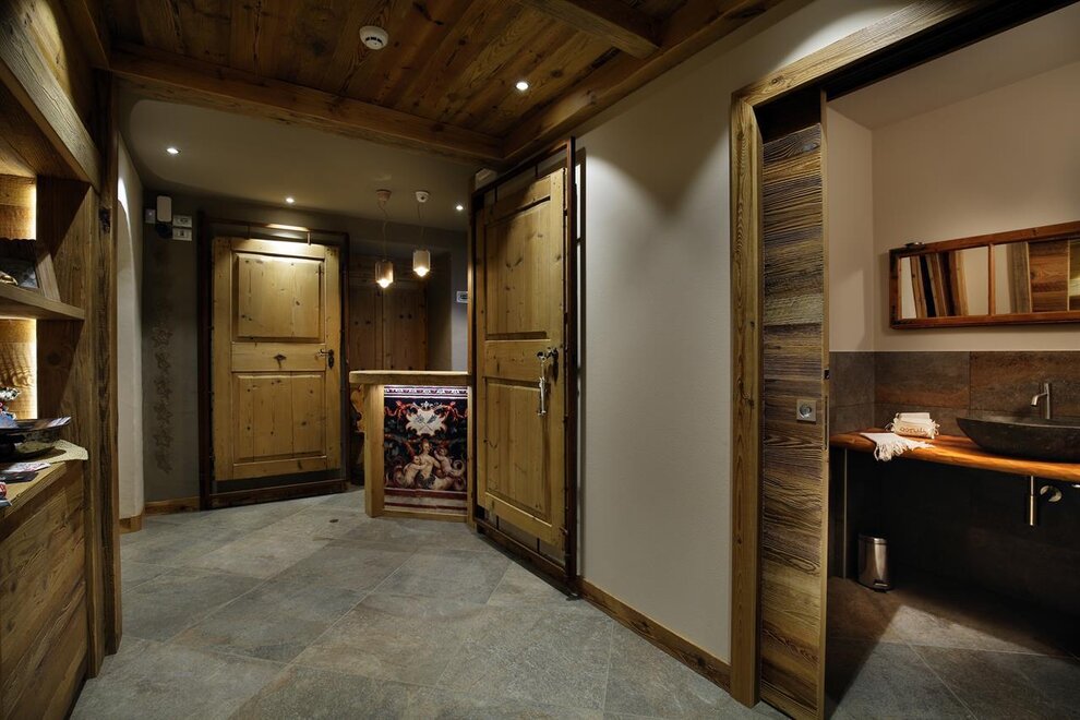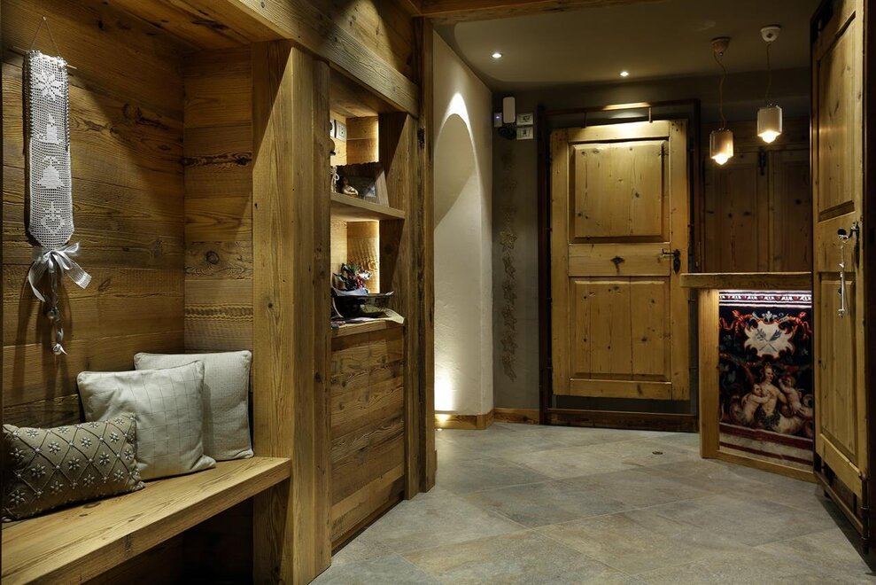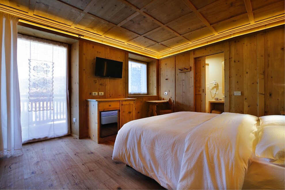 Tipica “Stua” (camera) di Fiemme realizzata mediante il riutilizzo di rivestimenti originali in legno antico a specchi con piccola alcova finestrata e ampio balcone con vista sulle Pale di San Martino. Grande sala da bagno dotata dell’antico balconcino del Medico.