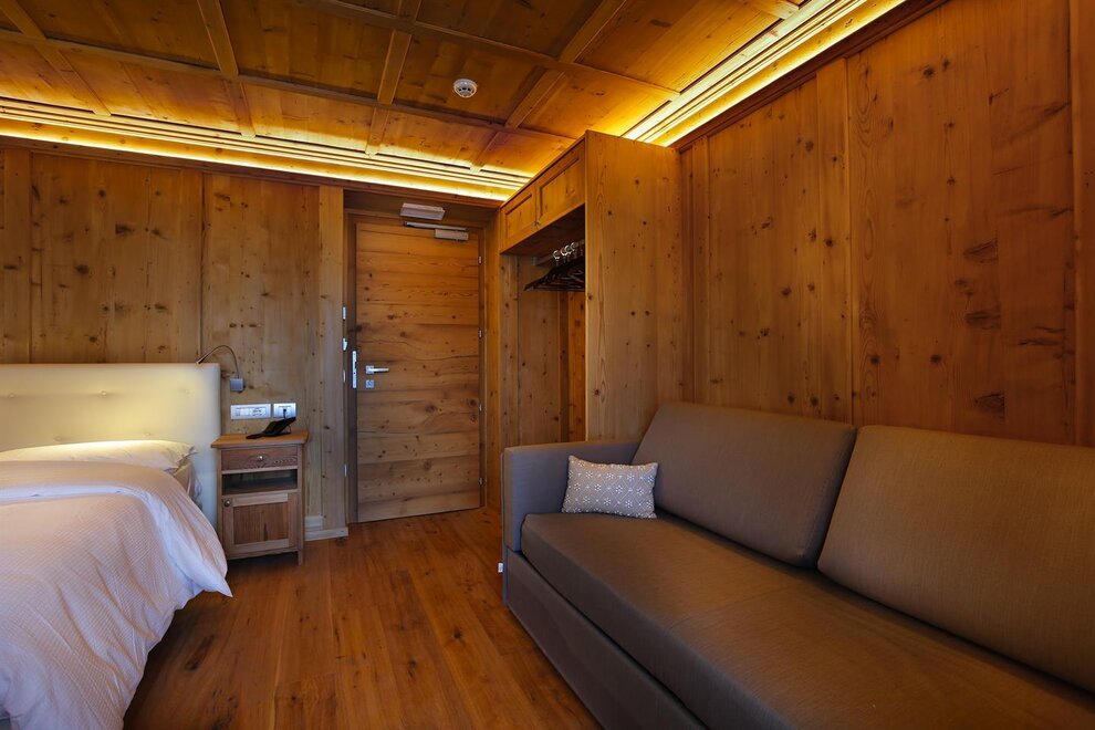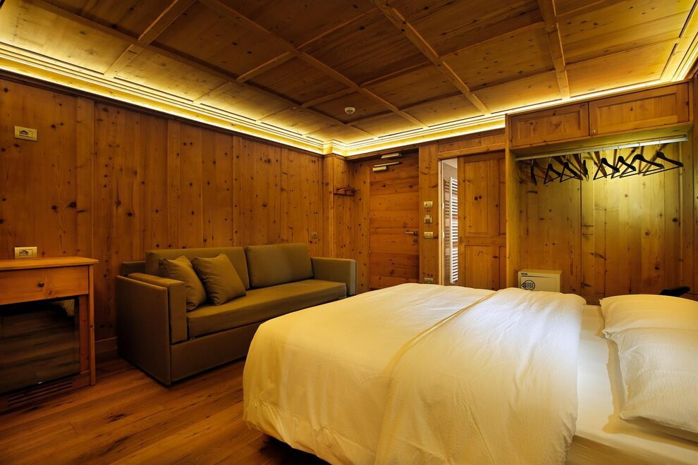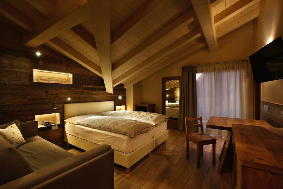 Spaziosa camera con angolo salotto, creata con pannelli di legno antico con telai in Larice e importante testa del letto in ecopelle naturale. Il grande poggiolo con vista sulle maestose Pale di San Martino vi permetterà di ammirare spettacolari tramonti e l’albeggiare del nuovo giorno.