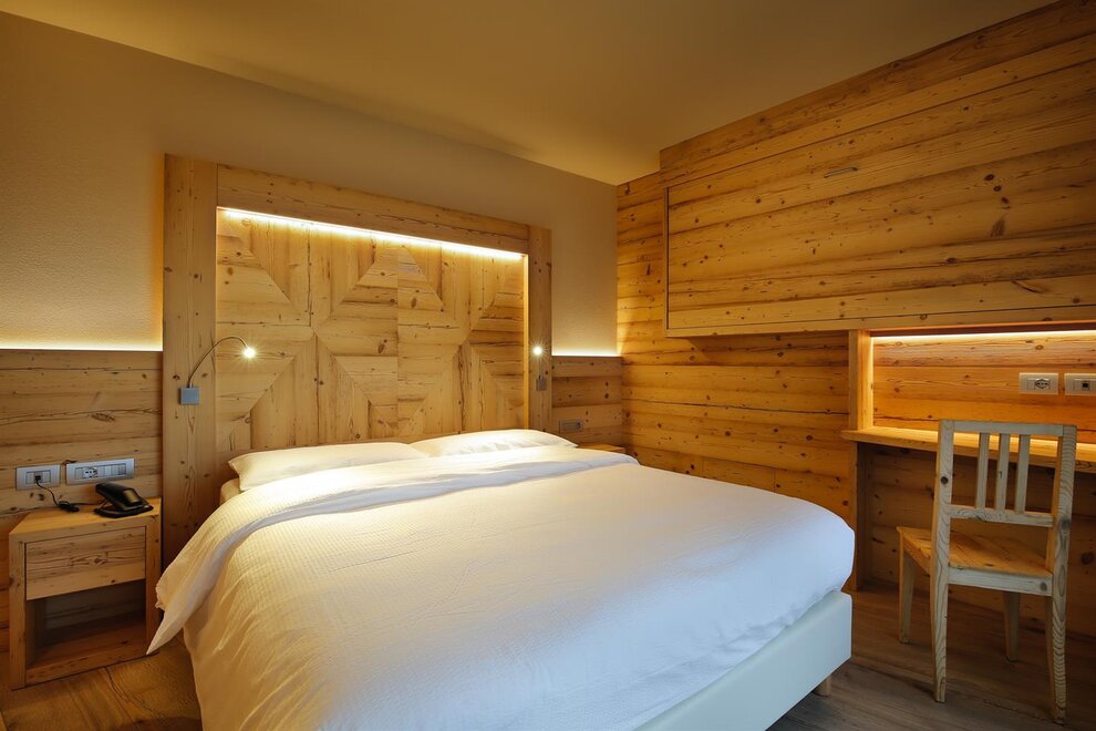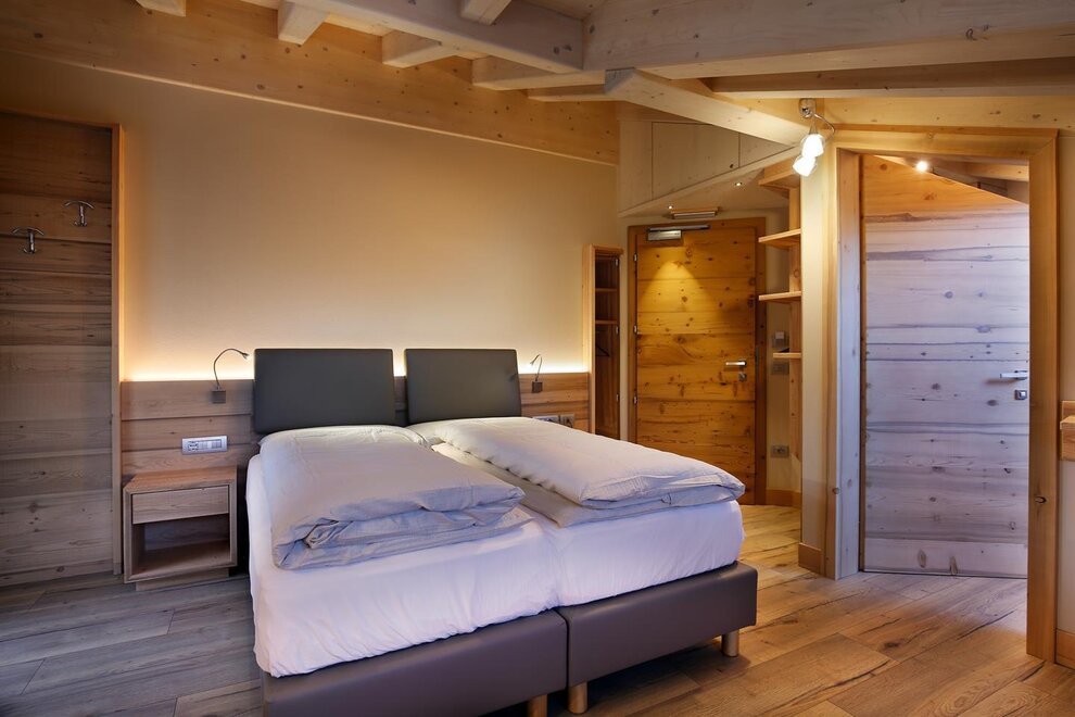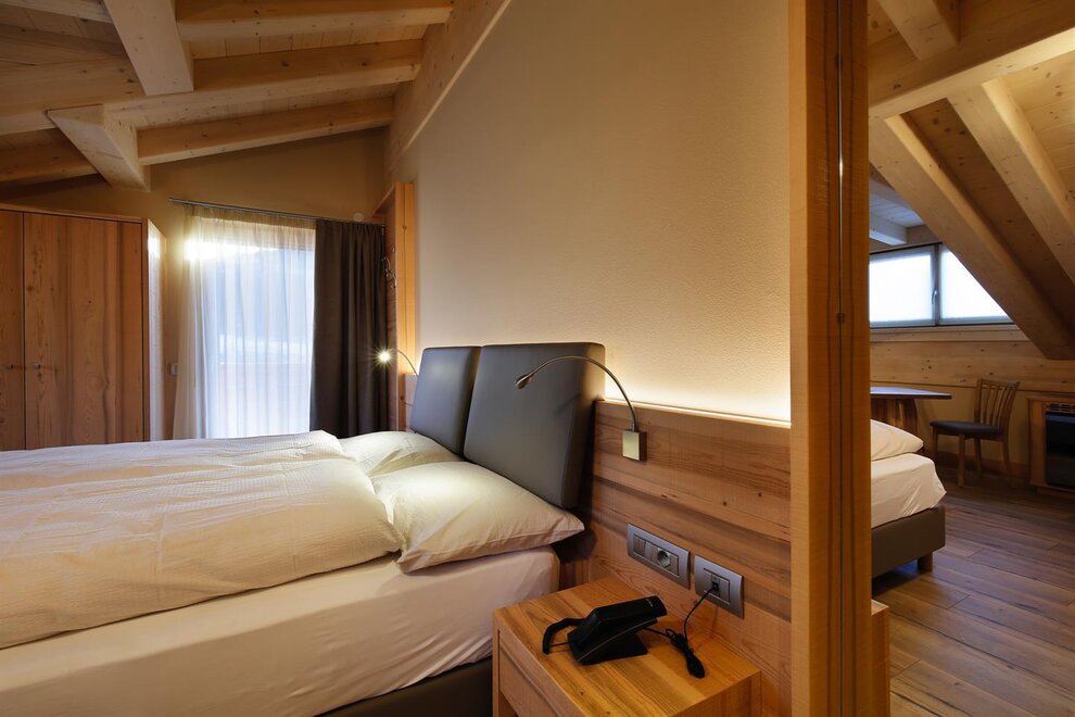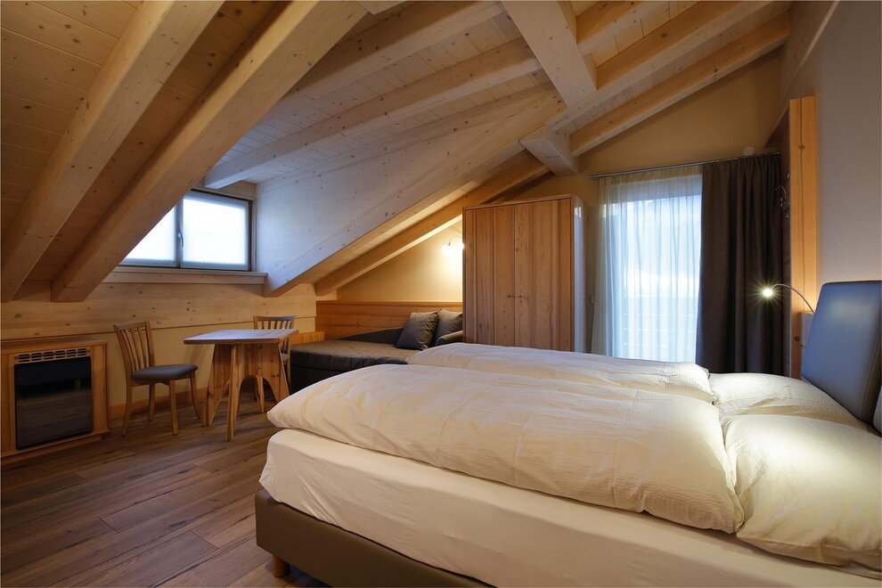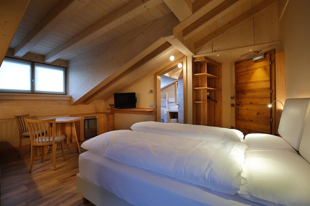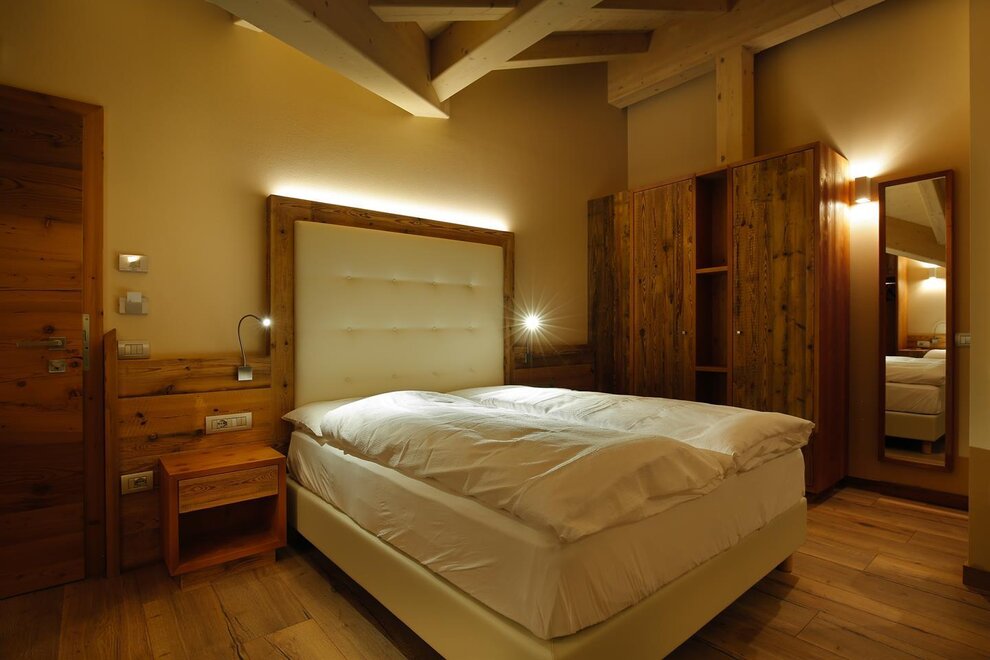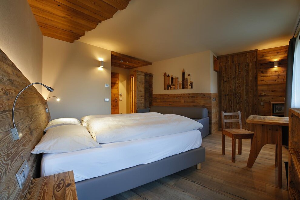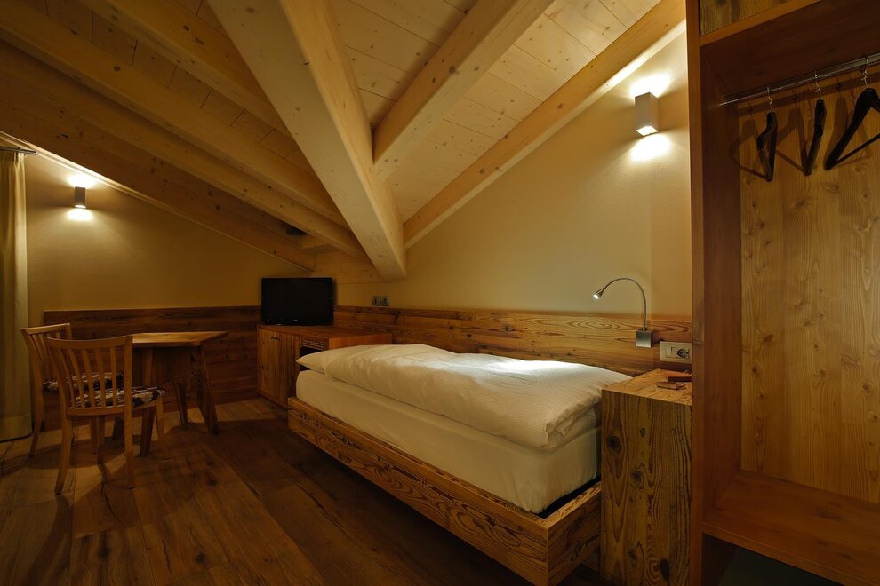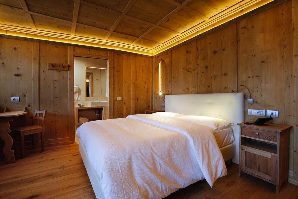 Camera realizzata in Cirmolo, legno molto pregiato che tra le sue tante doti ha quella di essere un antiacaro naturale. Dormire in una camera realizzata in Cirmolo è il massimo del relax naturale per attingere nuove energie. Soffito a travi e colori leggeri vi coccoleranno.