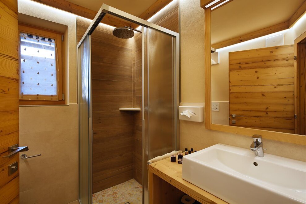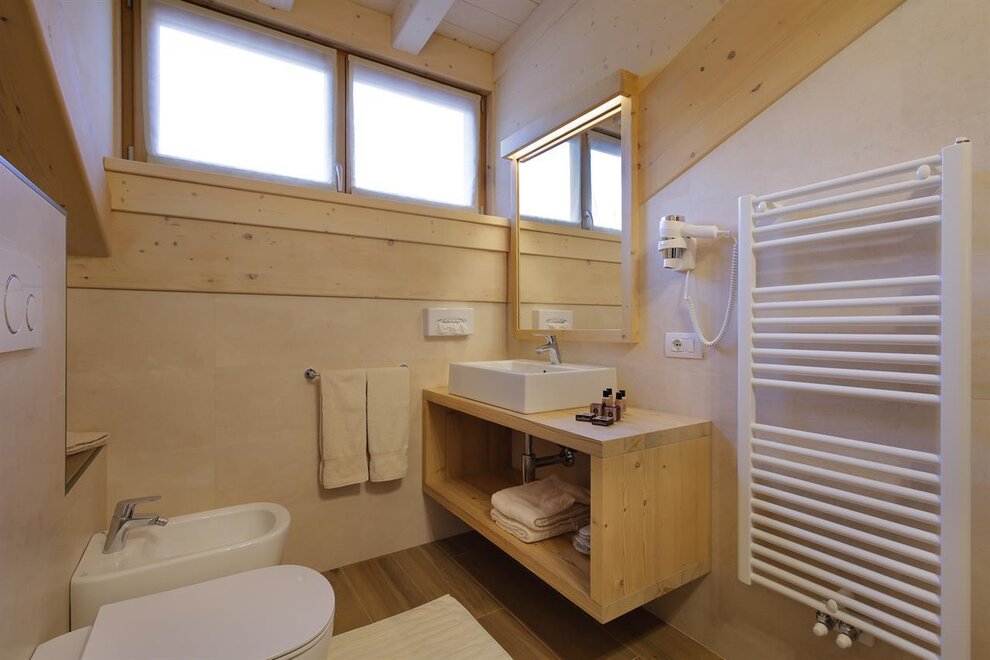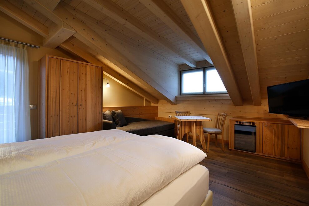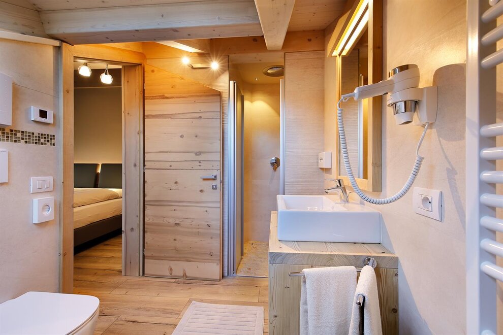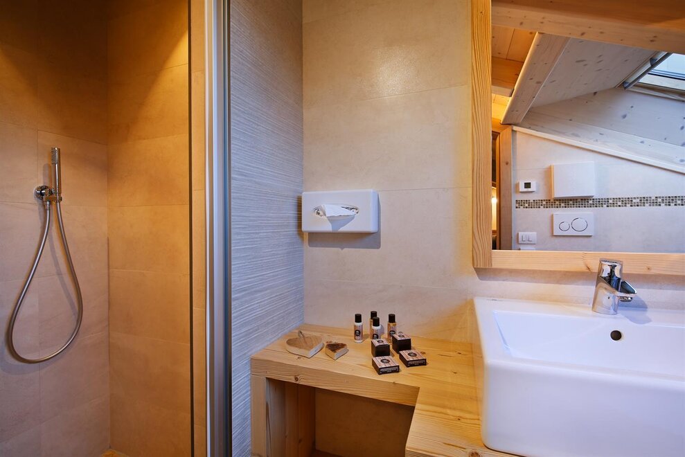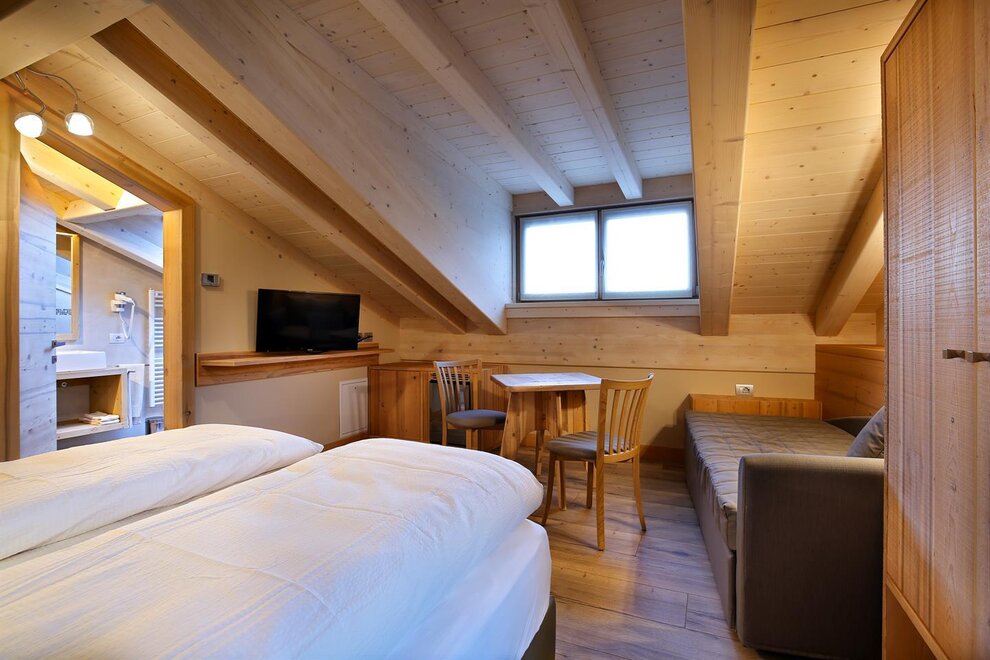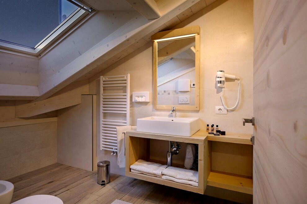 L’abete rosato è il legno dominante in questa bellissima camera con poggiolo affacciato sull’ Alpe Cermis. Sala da bagno ricavata in un grazioso sottotetto mansardato