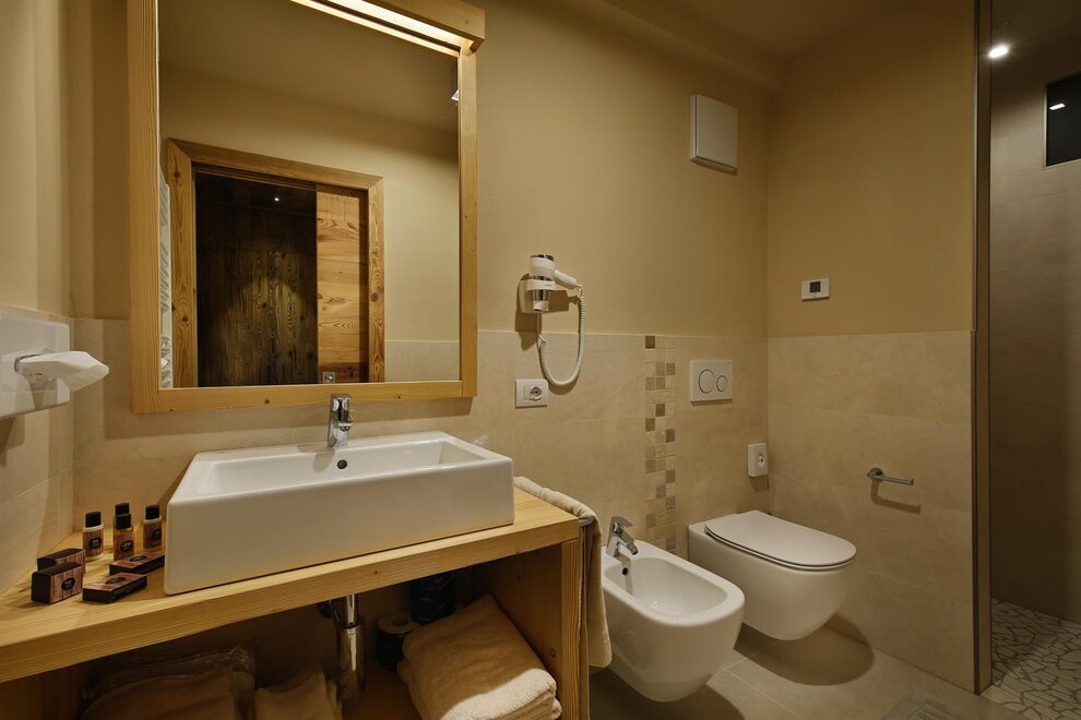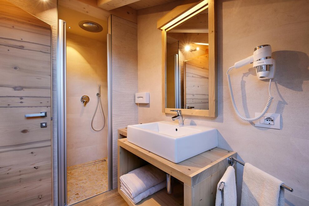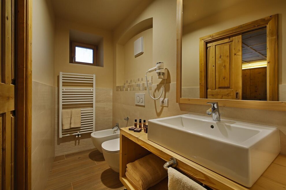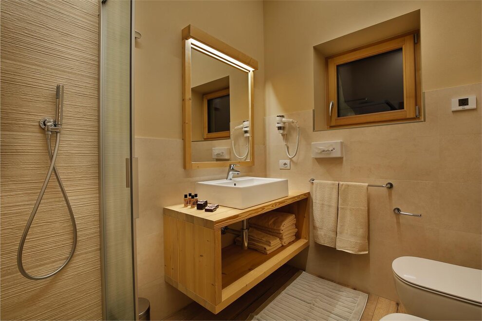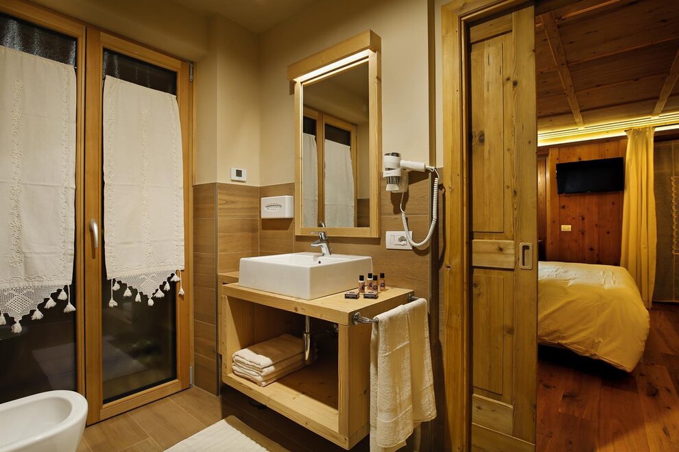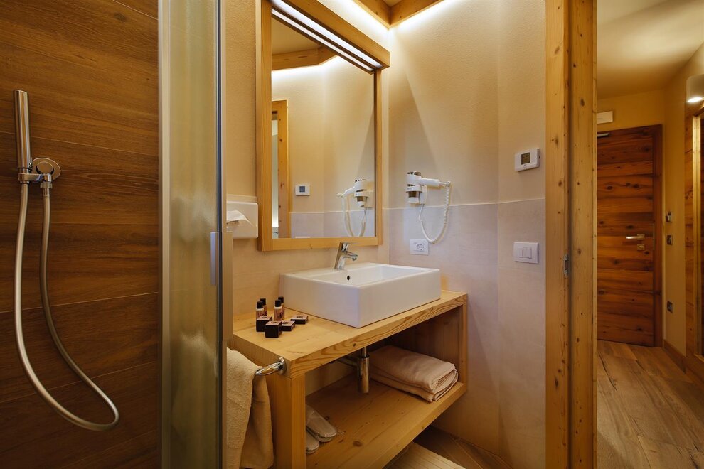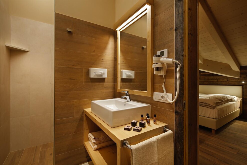 L’abete rosato è il legno dominante in questa bellissima camera con poggiolo affacciato sull’ Alpe Cermis. Sala da bagno ricavata in un grazioso sottotetto mansardato