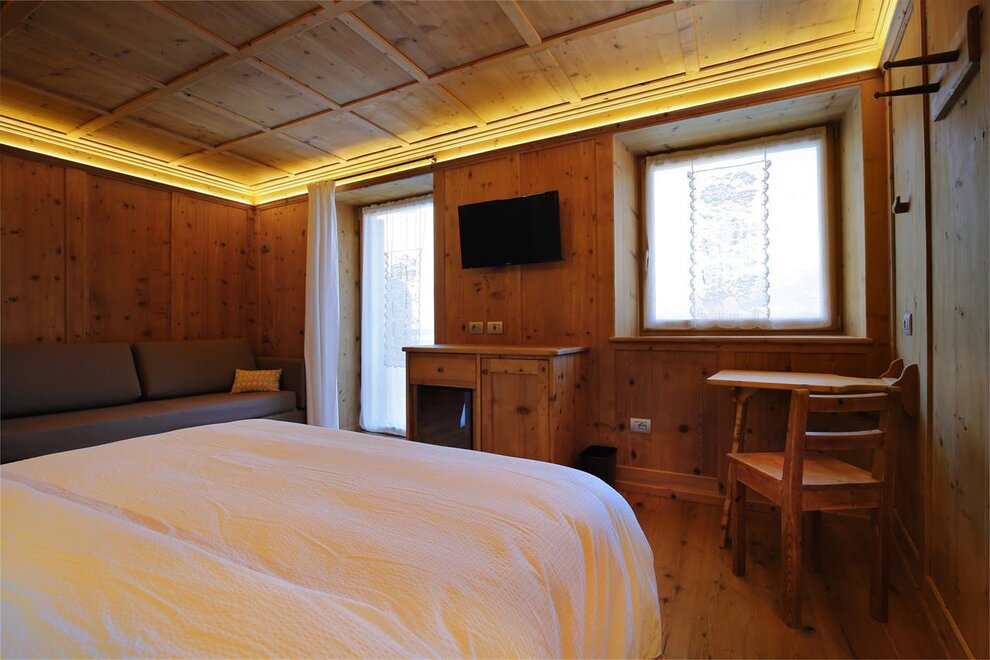 Camera creata con legno antico dai colori decisi, ideale per trascorrere momenti indimenticabili. Dotata di grande poggiolo con vista sul nostro giardino e sull'impianto dell'Alpe cermis.