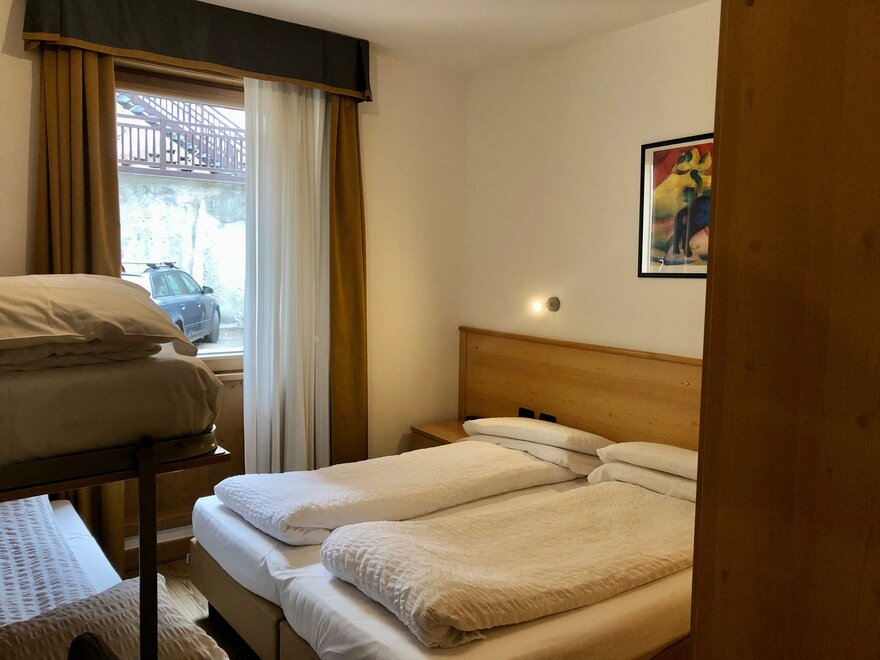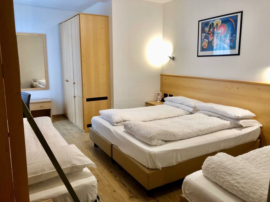 Stanza familiare con letto matrimoniale e letto a castello aggiunto, vista sul bosco o lato strada, pavimentazione in parquet.