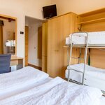 Stanza familiare con letto matrimoniale e letto a castello aggiunto e pavimentazione in parquet , situata al piano terra con vista sul parcheggio.