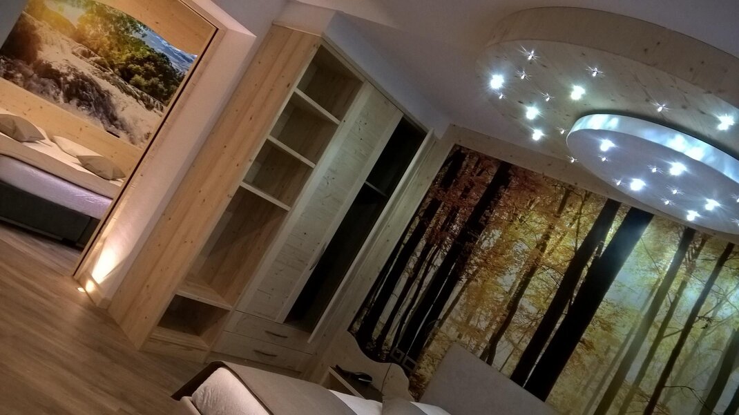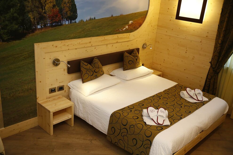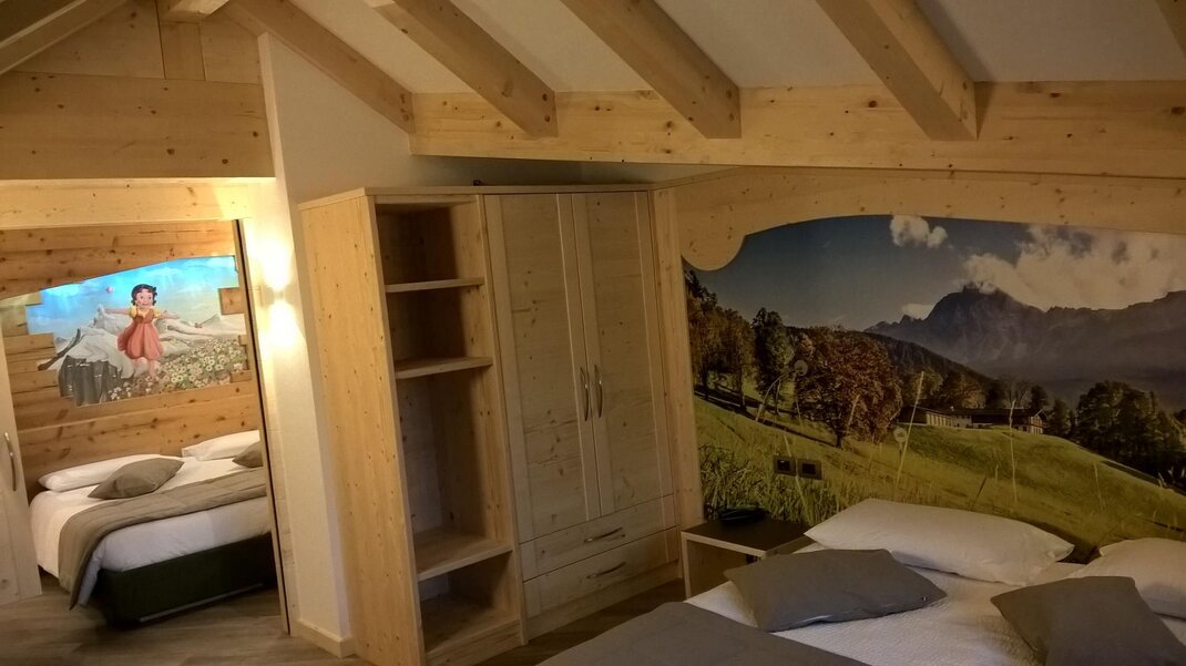 La camera per famiglie è composta da 1 disbrigo + 1 bagno+ 1 camera matrimoniale + 1 cameretta. Dotata di 2 TV, telefono, cassaforte, asciugacapelli. La camera ha il balcone ed è arredata in abete bianco.