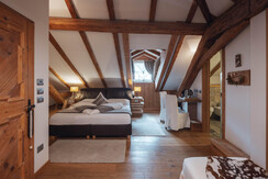 Exclusive attic room suites with refined fir wood floor. This room has all of the best mod cons, a living room, two satellite TVs, bathroom with shower, Sky, safe, phone, WiFi, tea and coffee corner, mini-bar, bathroom with bidet, lavatory, hairdryer, enlarging mirror for make-up, courtesy set with products made with local natural herbs. Set for Wellness center.