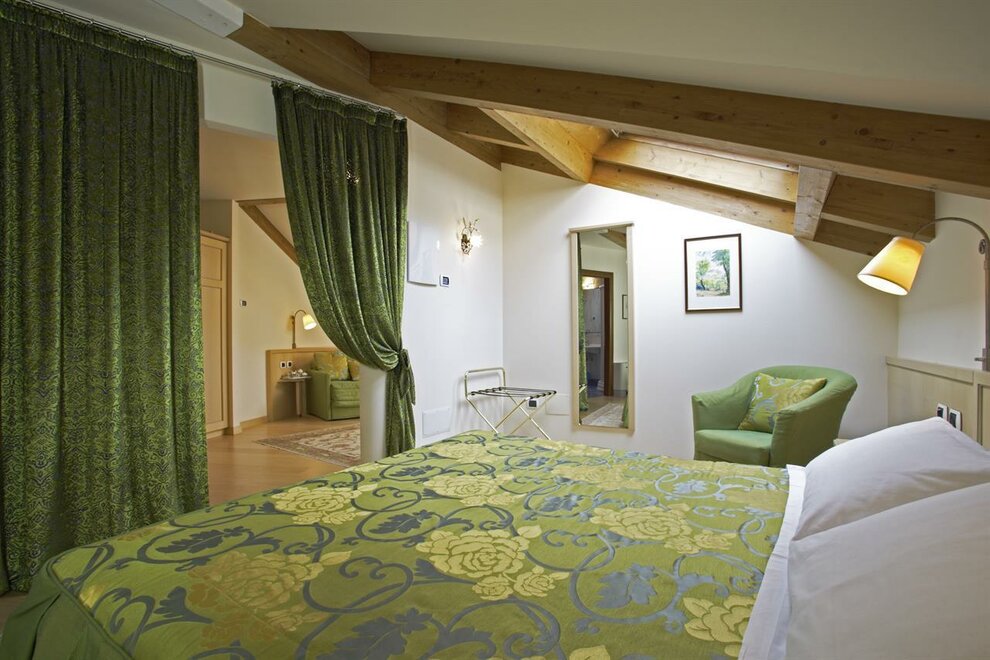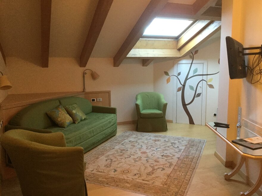 Stanza con letti over size matrimoniali (o divisi) di 35mq con salottino. Dotata di aria condizionata e divano letto per la terza e quarta persona. L’arredamento presenta tendaggi e tappezzerie di alta qualità. Il pavimento è in legno di betulla. E' dotata di cabina armadio, mobile scrittoio, Tv da 28 pollici, Tv Sat, frigo bar, cassaforte, telefono, connessione Wi-Fi gratuita. Dotata di due bagni , ciascuno con proprio box doccia , phon e specchio ingranditore. Parcheggio e garage gratuito. Colazione servita a buffet con ampia scelta di prodotti freschi tra cui spremute di arancia e crepes alla nutella e/o marmellata