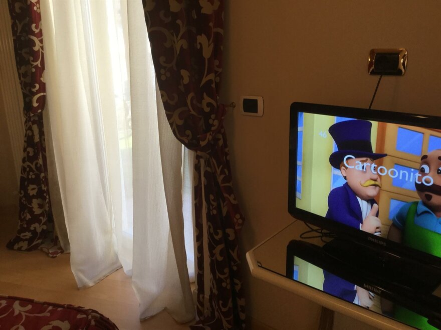 Stanza con doppi letti over size solo matrimoniali di 42 mq con salottino, balconcino, molto luminosa ed accogliente. Bagno spazioso con doccia attrezzata. L’arredamento presenta tendaggi e tappezzerie di alta qualità. Il pavimento è in legno di betulla. E' dotata di cabina armadio, mobile scrittoio, Tv da 28 pollici, Tv Sat, frigo bar, cassaforte, telefono, connessione Wi-Fi gratuita. Il bagno è dotato di box doccia (una anche con vasca), phon e specchio ingranditore