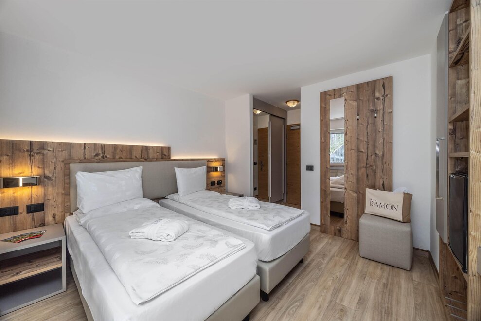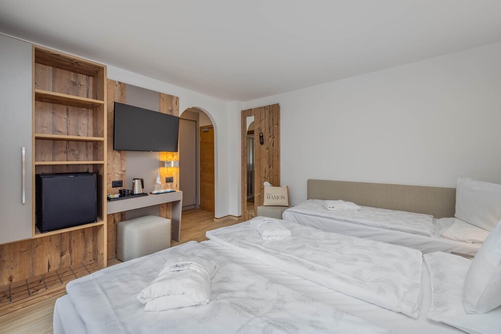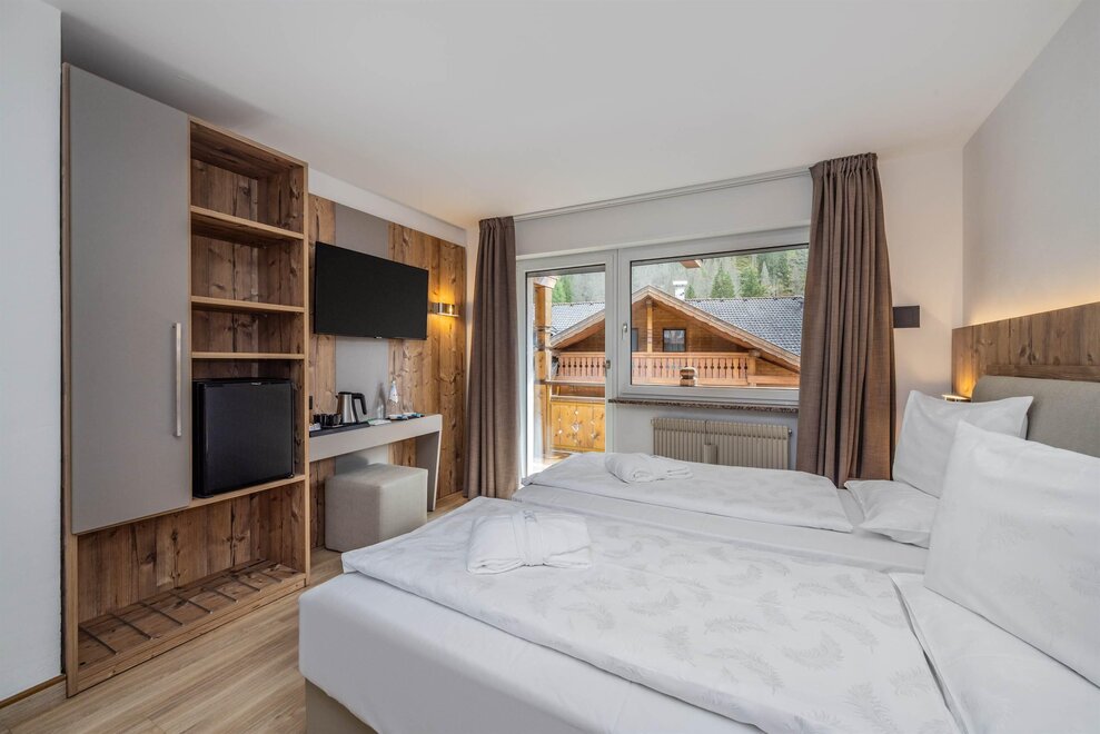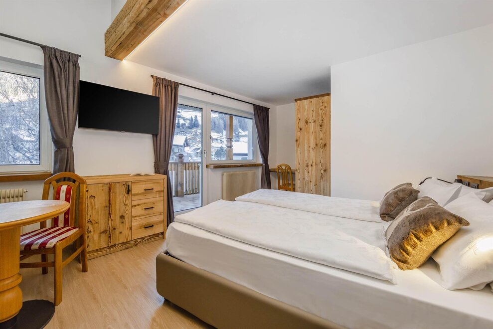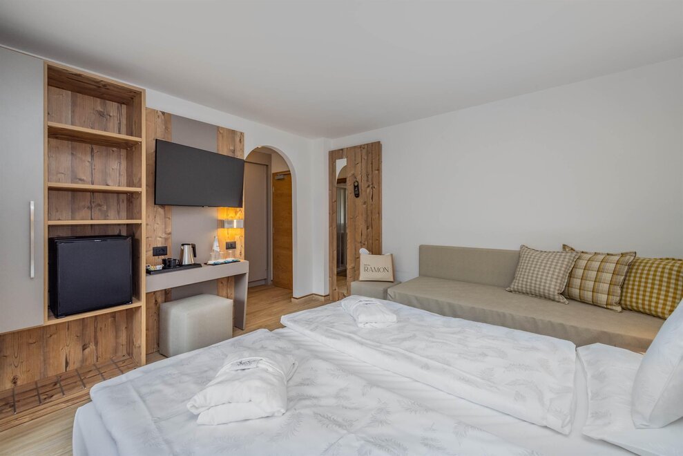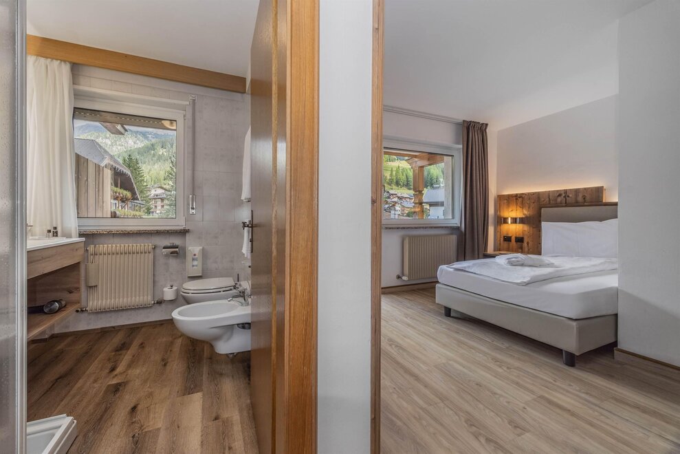 Goditi momenti di relax e i panorami mozzafiato sulle Dolomiti insieme alla tua famiglia o agli amici. Questa tipologia di camera è ideale per ospitare fino a 3 persone, configurabile con un letto matrimoniale e un letto singolo, oppure con tre letti singoli separati.Dettagli: