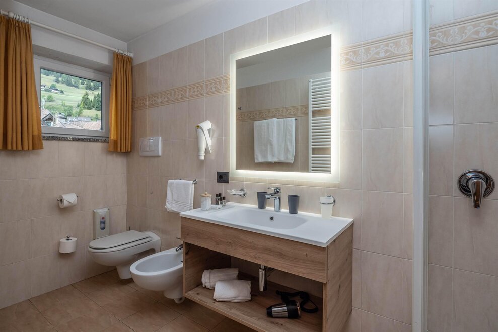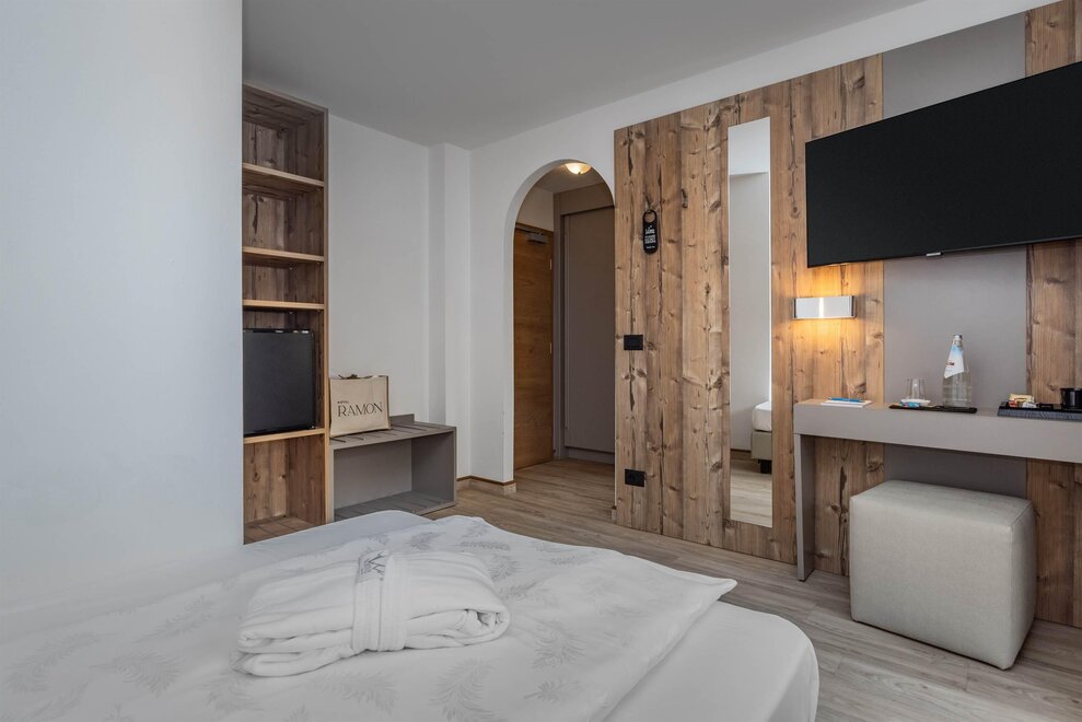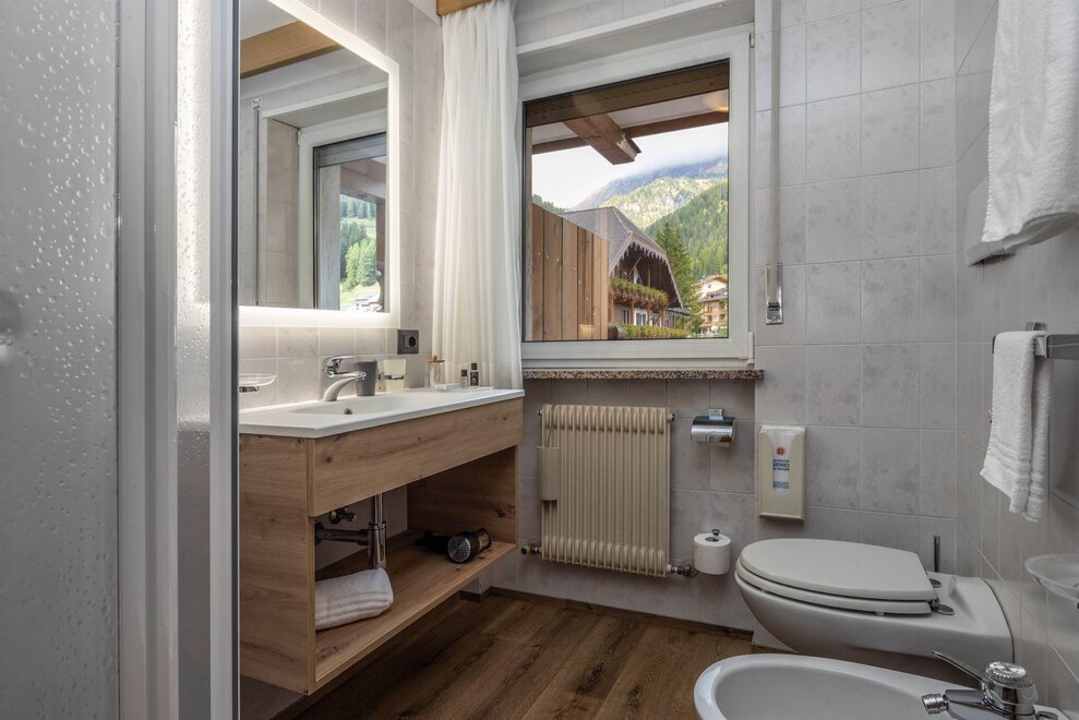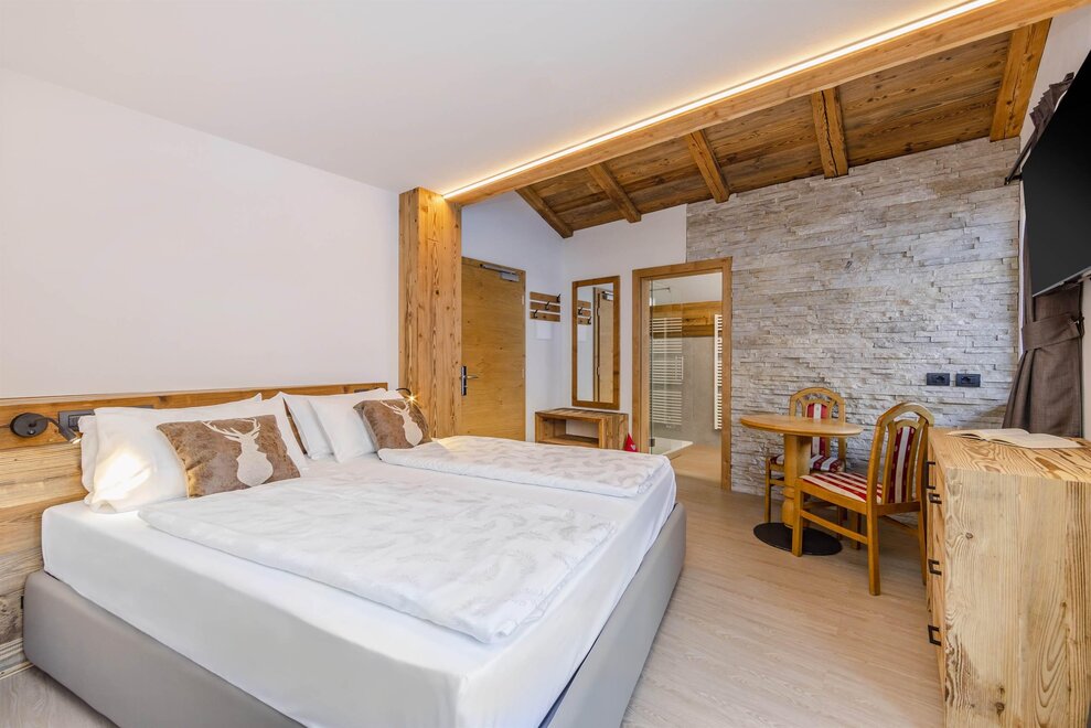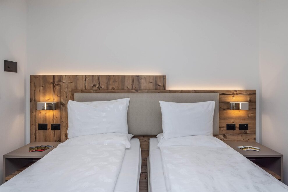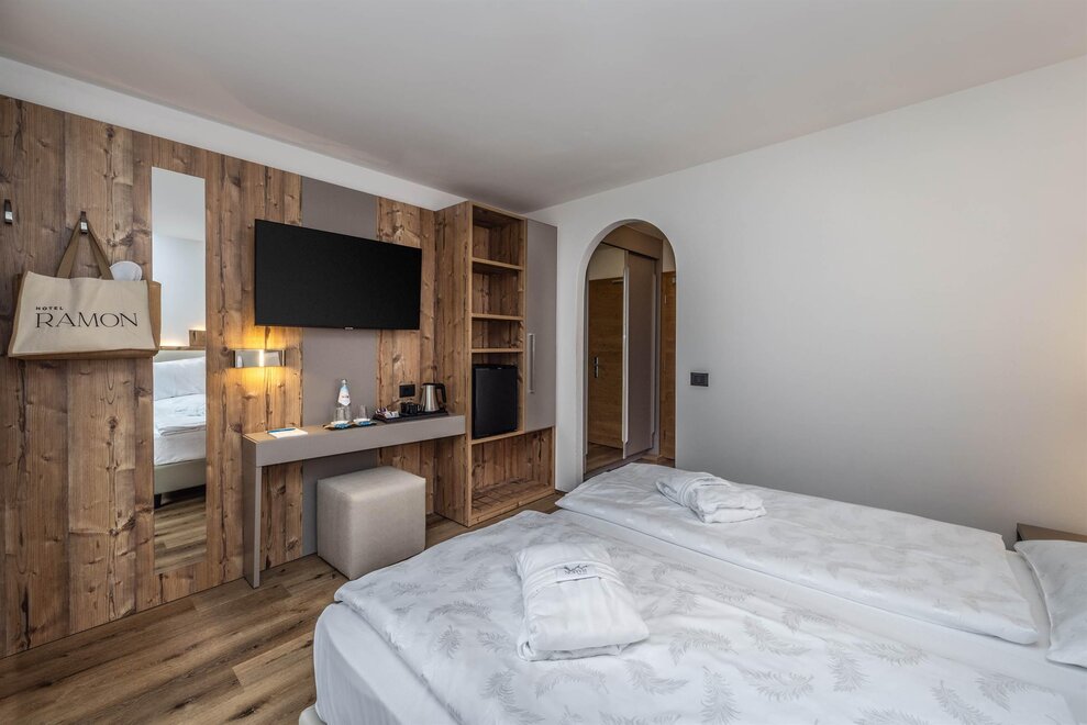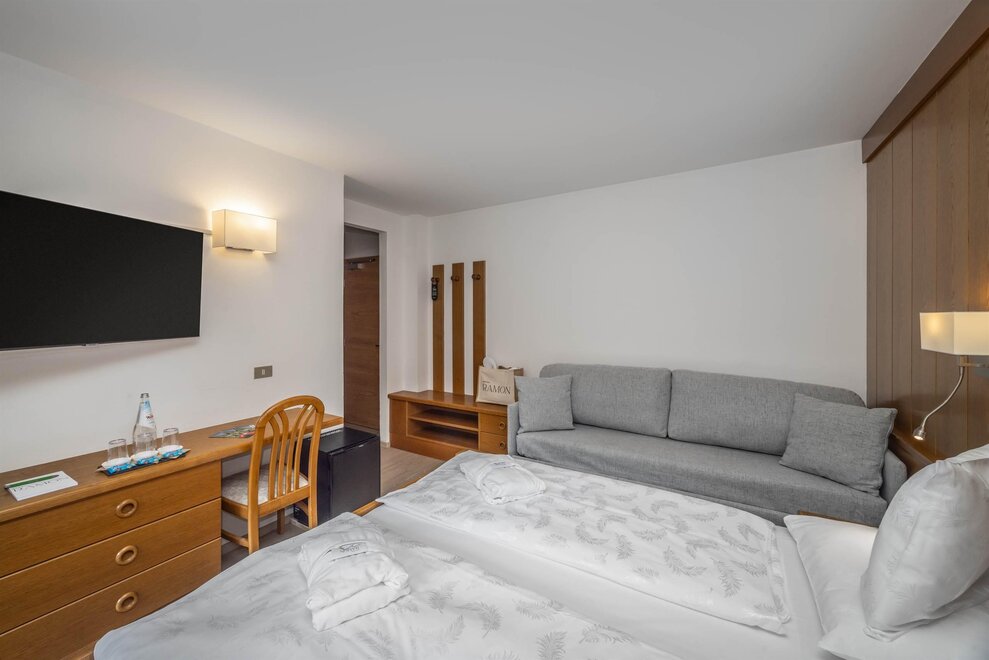 Goditi momenti di relax e i panorami mozzafiato sulle Dolomiti insieme alla tua famiglia o agli amici. Questa tipologia di camera è ideale per ospitare fino a 3 persone, configurabile con un letto matrimoniale e un letto singolo, oppure con tre letti singoli separati.Dettagli: