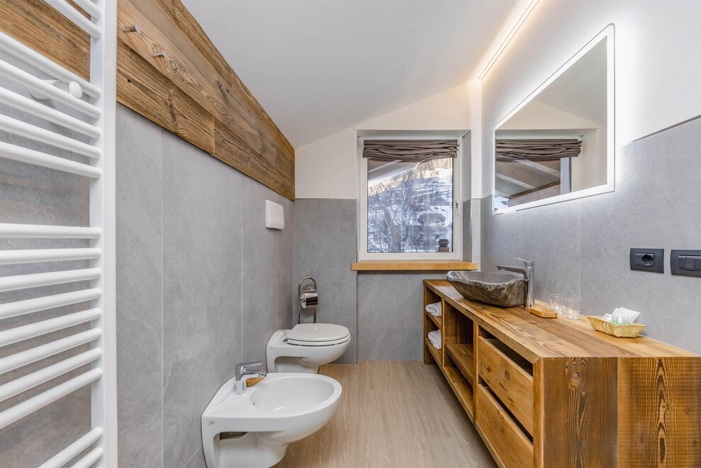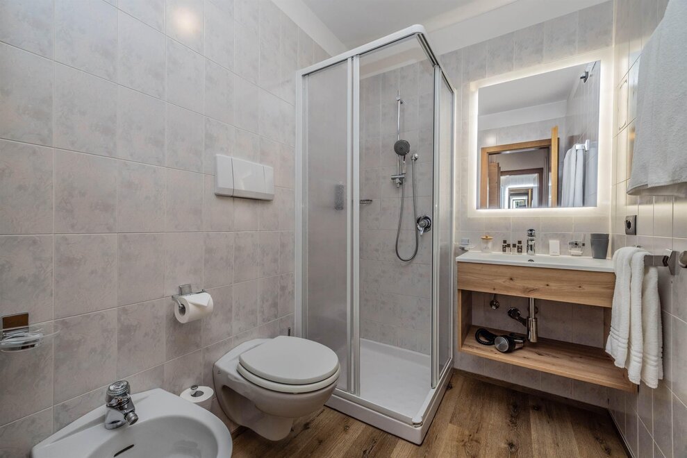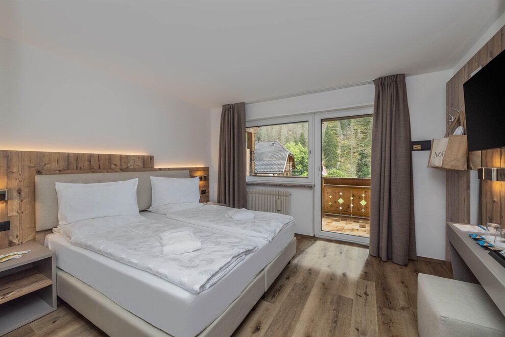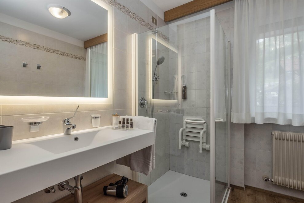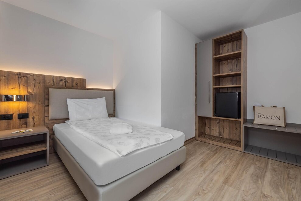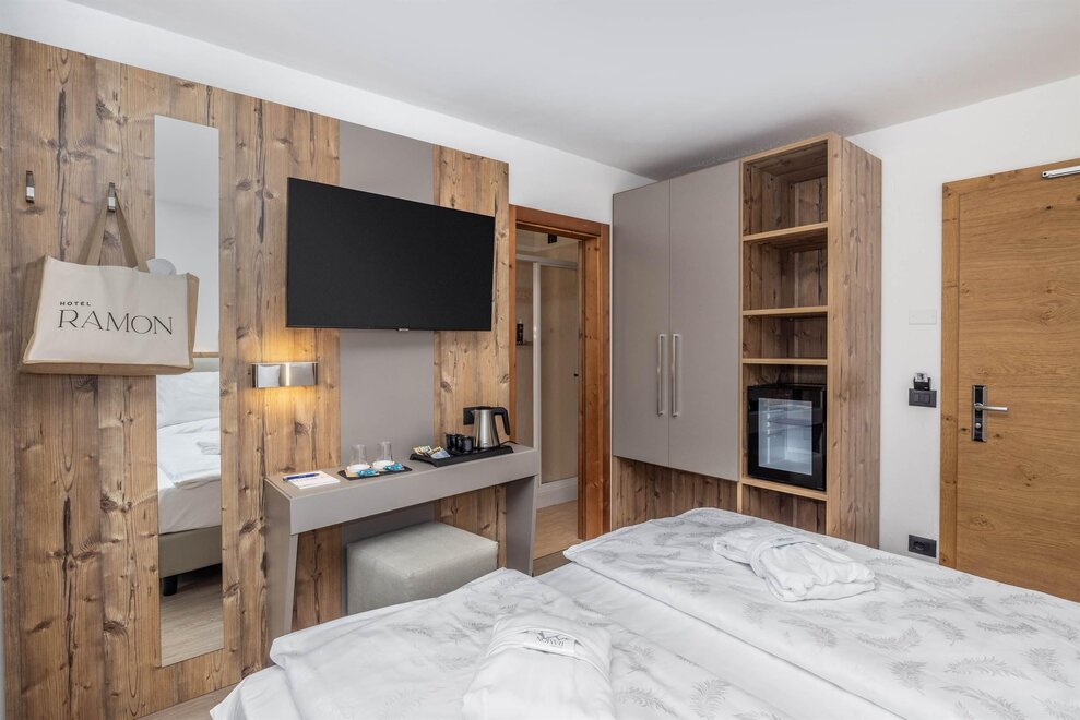 Goditi momenti di relax e i panorami mozzafiato sulle Dolomiti insieme alla tua famiglia o agli amici. Questa tipologia di camera è ideale per ospitare fino a 3 persone, configurabile con un letto matrimoniale e un letto singolo, oppure con tre letti singoli separati.Dettagli: