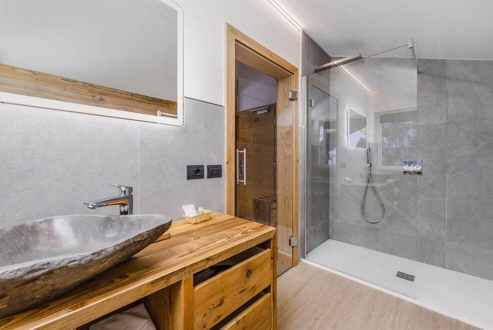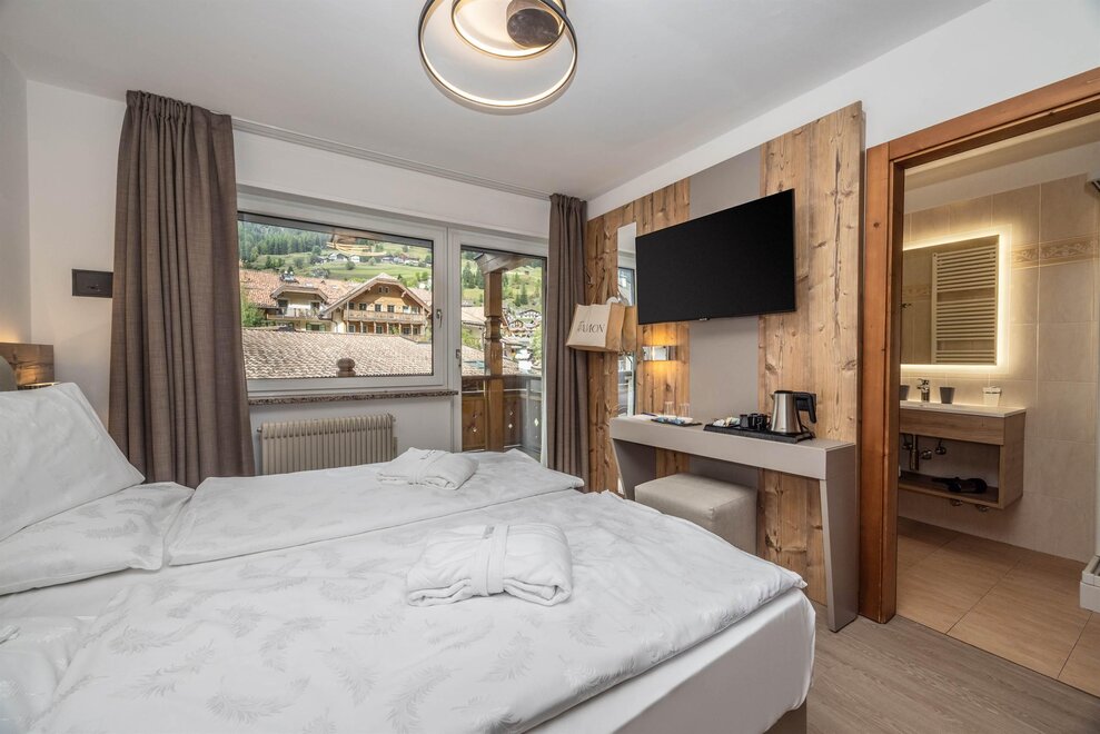 Spaziosa e romantica camera per 2 persone. Dotata di balcone con vista sul Sassolungo, raffinato bagno con grande doccia e finiture di pregio, frigobar, accappatoio e ciabattine.