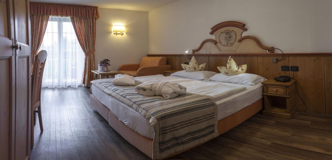 Camera arredata con stile legno di cirmolo testata decorata a mano esposta lato sud 2 letti, balcone (temperatura riscaldamento programmabile in camera) divanoletto, cassaforte, frigo bar, TV sat. connessione wireless, attrezzata di bagno wc-bidet doccia-asciugacapelli MT. 28-35.